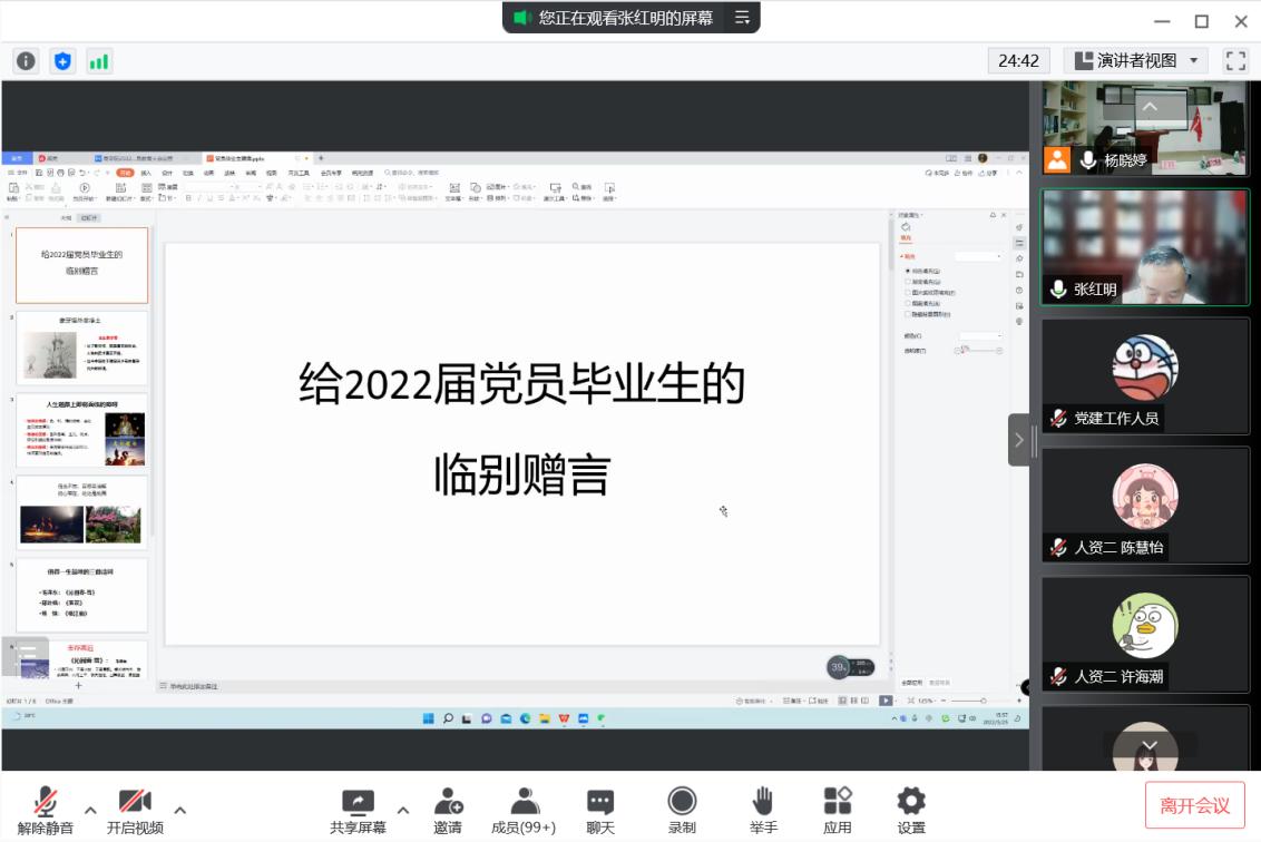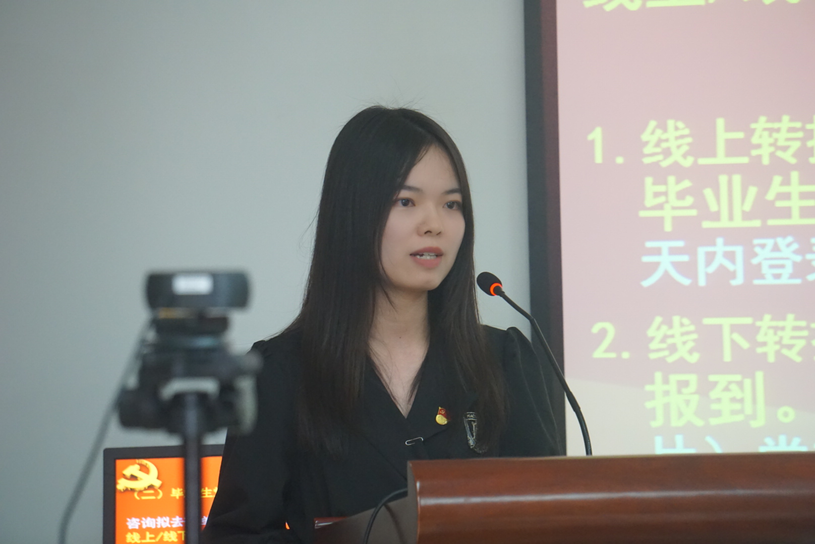 紧接着,向媛薇讲解毕业生党员组织关系事宜,帮助应届毕业生解决在组织关系转接中面临的一系列问题。讲解中她强调,毕业生党员们要高度重视并落实组织关系转接事宜。同时她也希望毕业生党员们提升主动担当意识,增强组织观念,自觉发挥模范带头作用,以自身的实际行动积极践行入党誓词,做中国特色社会主义事业的合格建设者和可靠接班人,以优异的成绩为母校增光添彩!