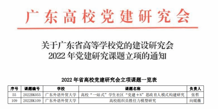 近日,广东省高等学校党的建设研究会公布了2022年党建研究课题立项结果,bevictor伟德2项课题获得立项,全校共获立项5项,bevictor伟德立项率占全校立项数40%,立项数量创历史新高!