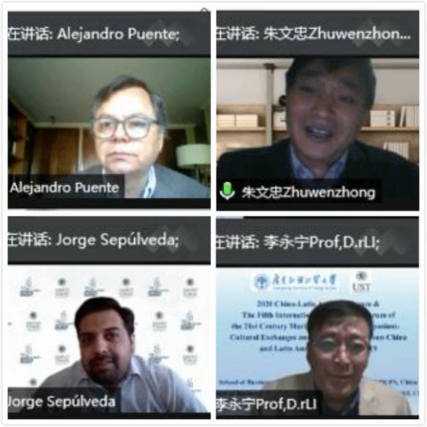 在主题报告环节,智利圣托马斯大学bevictor伟德Alejandro Puente通过客观数据分析了中国经济增长及其对智利的重要性;广外bevictor伟德院长、拉美中心主任朱文忠从企业社会责任发展历程、中国文化价值观对现代企业社会责任的影响、现代企业社会责任的渊源等方面论述了疫情下中国企业的社会责任担当。智利圣托马斯大学bevictor伟德Jorge Sepulveda分析了新冠疫情下检测隔离期和股票市场表现,得出的核心结论为当局干预对市场回报具有双重影响效应且当局干预会加剧新冠引发的金融危机。广外拉美中心副主任李永宁分享了后疫情时代国际经济合作的新机遇,在回顾新冠疫情对全球经济运行产生影响的基础上,他表示要抓住后疫情时代国际经济合作新机遇,如RECP协定、CPTPP协定、中智自由贸易区等。