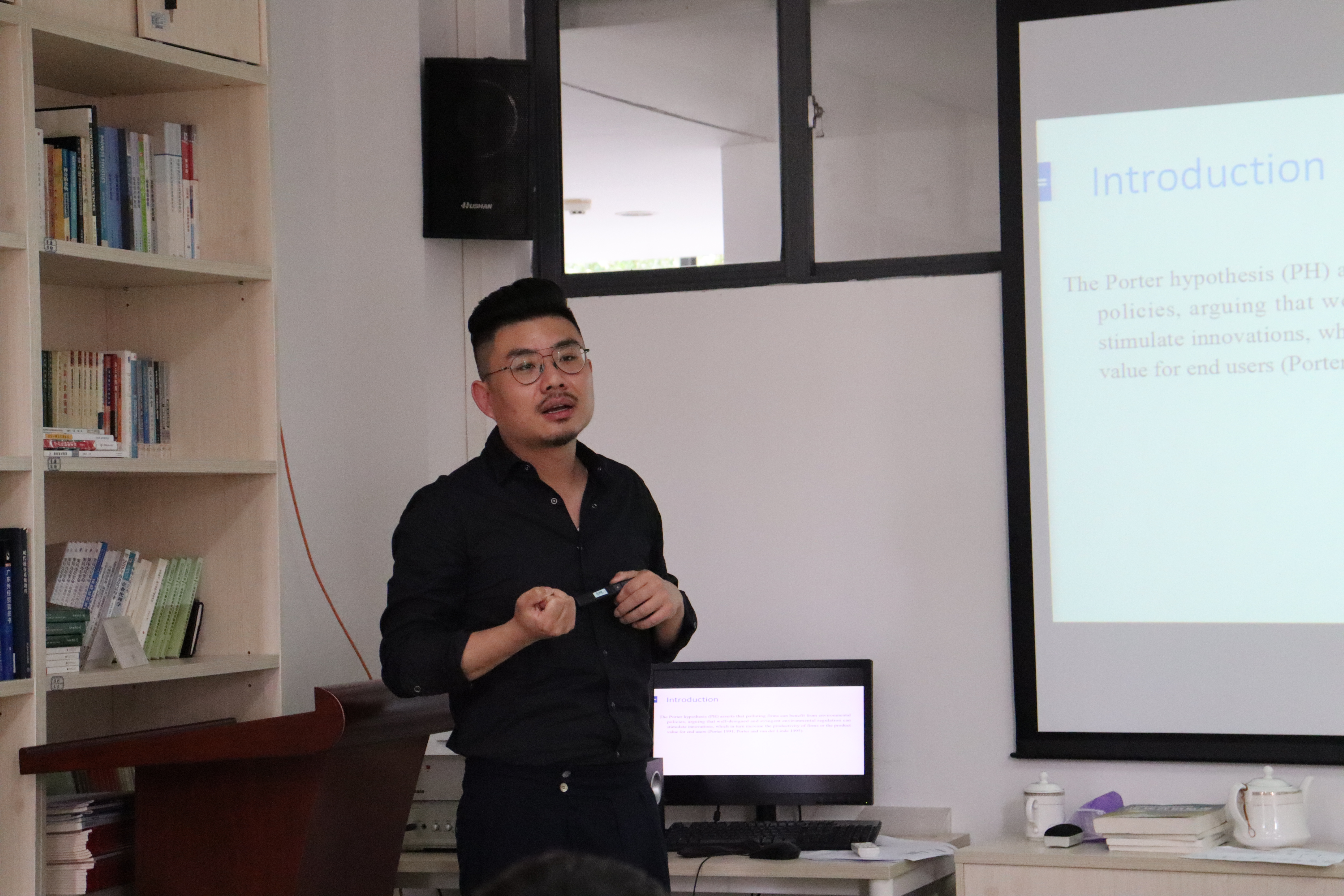 首先,唐凯老师为在座师生分享题为《Rent-seeking or innovation? Environmental regulation and enterprise behavior》的学术研究。在高质量发展导向下,国家所制定的环境规制政策体系日益严格,企业所面临的环保压力不断加大。合理设计的环境规制被认为对技术创新具有重要促进作用,即环境规制的波特假设(PH)认为,企业试图通过R&D投入来提高企业治理污染的能力以及产品的科技含量,进而抵消环境规制给企业经营绩效所带来的不利影响。然而发展中国家或新兴国家因市场化水平、文化程度等因素与发达国家存在一定差异,因而波特假说(PH)是否成立,以及在环境规制的约束下,受监管企业将采取短期的寻租行为还是长期的创新行为同样值得学术探究。