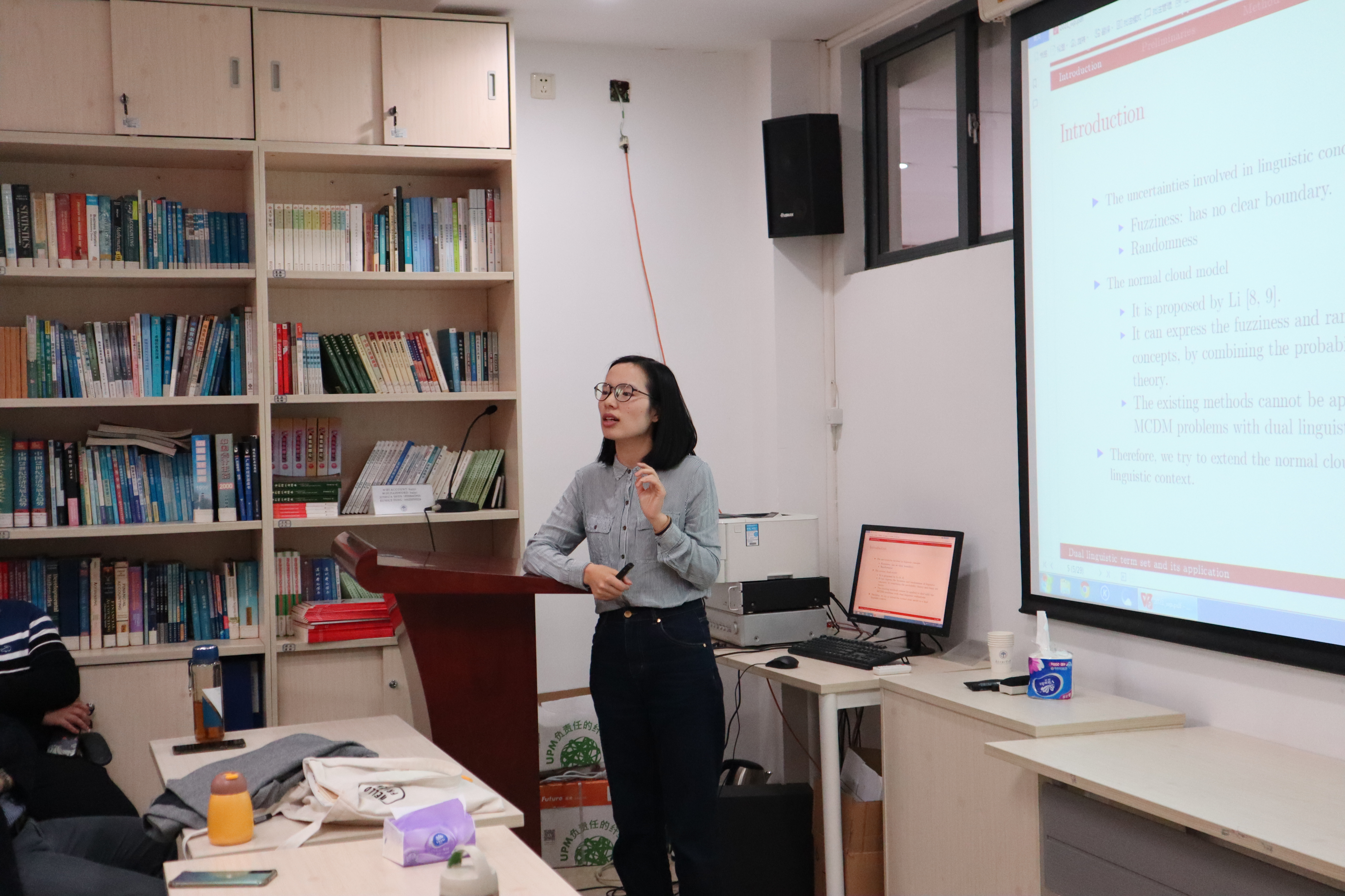 紧接着,王佩老师为大家分享了题为《Dual linguistic term set and its application based on the normal cloud model》的文章。近年来,学界提出了一些包含概率信息的复杂语言表达技术,如比例语言术语、概率语言术语集等来描述意见和偏好的不确定性。然而,概率信息被表示为清晰的数字,这通常是难以估计的,并可能存在信息损失。为了更全面、准确地捕捉决策信息固有的模糊性,王佩老师引入了一个由两个语言变量组成的双语言术语集(DLTS)概念。DLTS可以使决策者通过语言变量来表达概率信息。为了描述决策者的犹豫信息,提出了犹豫模糊双语言术语集(HFDLTS)。在此基础上,王老师提出了一种基于标准云模型的双语言信息多准则决策方法。王佩老师首先将DLTS转换为由两个独立正常云组成的等效2元组,然后通过定义普通云的新乘法运算和幂运算,得到每个属性值的期望。在汇总评价信息后,王老师进一步开发了一个新的评分函数来合理地对备选方案进行排序。最后,王老师通过一个算例验证了所提方法的有效性和可行性,并通过对比分析说明了所提方法的优越性。主题分享结束后,在座师生也针对相关研究向两位老师提出若干问题,两位老师也耐心地作出一一解答。