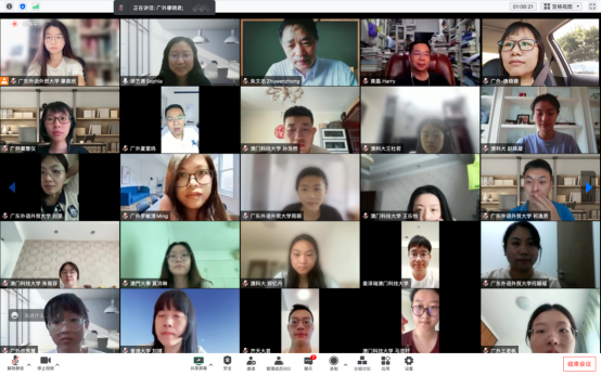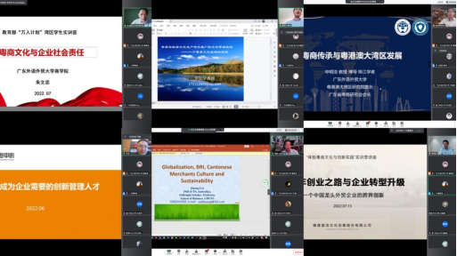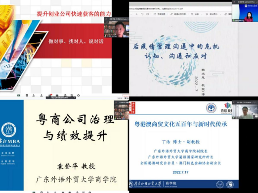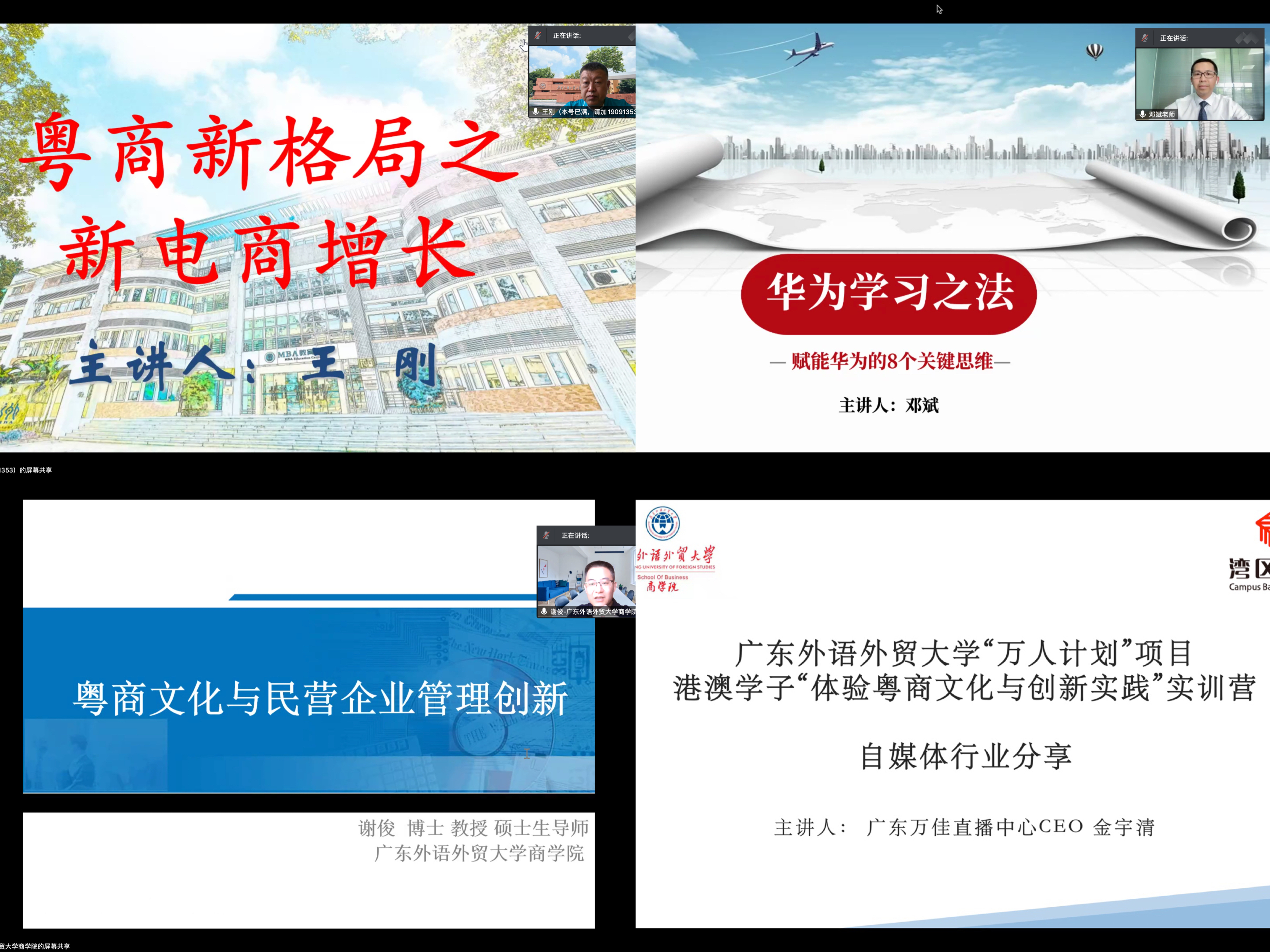 谢俊教授通过详细介绍粤地企业发展的历史特征及演变历史,分析了粤商得以发展的独特优势及创新之举,鼓励同学们学习粤商敢为人先、低调务实、灵活变通等优良品质。广东万佳直播中心CEO金宇清以群直播的形式,从自身创业经历出发,介绍新媒体行业的现状,针对同学感兴趣的就业、创业等问题采用了连麦互动的方式为同学们答疑。澳门管理学院大湾区课程顾问方润成以《提升创业公司快速获客的能力:做对事、找对人、说对话》为题,提醒同学们要抓住客户心理,锁定关键人物以及分析业务机会。杨文慧教授的讲座以《后疫情管理沟通中的危机认识、沟通和应对》为题,讲解了疫情危机与危机认识、政治格局的变化等知识,并介绍其对未来国际关系格局的构建的展望及见解。袁登华教授采用知识点讲解和小组案例分析的模式先给同学们讲解了公司治理和公司管理知识点,再以百果园为例,让同学们分组对如何提升门店绩效进行了小组讨论及汇报,课程以理论和案例结合,提高参与感。丁浩副教授以时间为线索,向同学们介绍了五百年经贸文化的形成、激荡、变换等过程,以史为鉴,引领同学们思考在新时代如何做好传承者的角色。