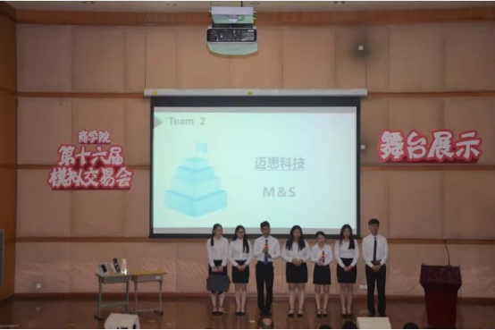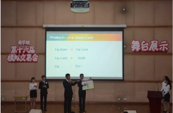 一涂创意团队的表现十分突出,展示风格十分清新独特。在展示过程中,他们首先通过一段轻松活泼的英语对话情景秀引出团队的主打产品——润唇卡。接着,队员使用模具进行实地操作,让观众更加形象可感地了解产品的设计构造“简约而不简单”,它的使用方法“方便又轻松”。团队新奇的想法和商业计划的易操作性得到了老师的好评,同时也给观众留下了深刻的印象。凭借出色的展示和机智的答辩,一涂创意团队获得了本次模拟交易会现场展示第一名的好成绩。