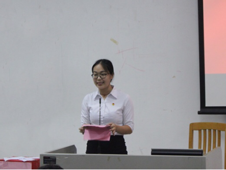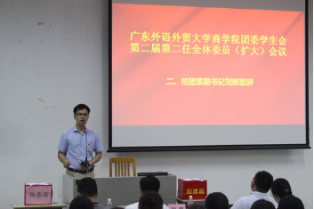奏唱国歌环节结束以后,校团委副书记刘郎同志对本次会议致辞。他首先代表校团委对本次会议的召开表示了关心和问候,对商院团委学生会的至今开展的工作取得的成果表示了肯定,同时对商院团委学生会的工作做大做强提出了三点建议:一、在创新开展bevictor伟德自身特色活动的同时,更好地以校团委的工作清单为中心开展工作;二、充分发挥各类活动的载体作用,更好地给参与者带来思想上的收获;三、让同学们充分认可并积极参加团学活动,更好地服务bevictor伟德学子成长成才。最后,刘郎同志衷心祝愿所有的干部干事都能够在团学这个平台上有所收获和成长,并预祝本次大会取得圆满成功。