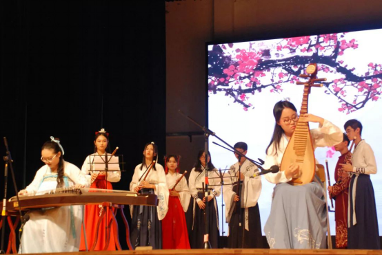 当传统民乐遇上江南水乡,一切都像水墨丹青般铺开,当曼妙舞步踏上青石板路,一切都迷蒙成漫天的烟雨。在心语协会的民乐表演《雨碎江南》中,让人仿佛穿越时空,沿着曲折的柳堤,静观鱼戏波,风吹浪。伴随着悠扬的旋律,一盏清茗,一缕芬芳,一袭青衫,一段温馨的往事,在青山流水间醉了往来的风。走过江南,一场沉醉不知归路的听觉盛宴徐徐展开。一个个异国或家乡的故事,在商院歌队的演绎中,浑然一体、燃爆全场。歌队带来的歌曲串烧《This Moment》,动听的歌曲,活跃的气氛,让晚会现场激情洋溢。
