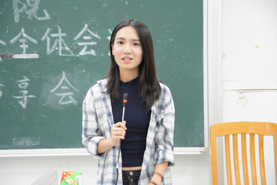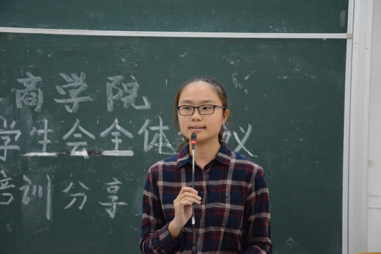 第三个发言的是2016级商院团学新生干事代表——来自学术与国际交流部的李欣。她表示,商院团学是一个富有特色的大家庭,同时它也是有效传达学校的规章制度和管理意向的沟通桥梁。接着她又讲述了自己加入团学前后的心路历程。最后,李欣同学代表2016级全体新生干事表达了希望创造精彩未来的美好愿望。