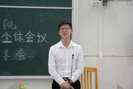 最后,上一届商院团学主席谭振锋分享了他在团学工作中的一些心得,向同学们提出两个建议:学习身边的人的闪光点、学会用创造使身边的事物变得不一样。这看似简单的话语中暗含哲理,包含了谭振锋对新干事们的美好憧憬与期盼,也希望同学们也能有所感悟。