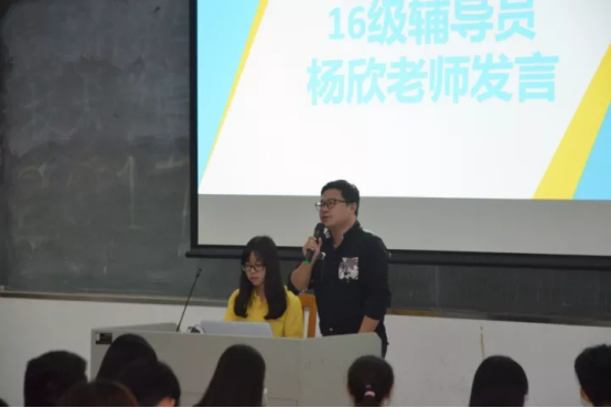 大会在掌声中开始,杨欣老师作为嘉宾代表致辞。首先,他感谢所有团干班干对班级建设的贡献,并提出商院全体团干班干应该发挥班级建设引领者的作用,积极推进实施基层团支部班团一体化建设,同时希望17级新任团干班干能在本次培训及先进班集体展示中有所收获,为接下来的班级工作开展打下坚实基础。