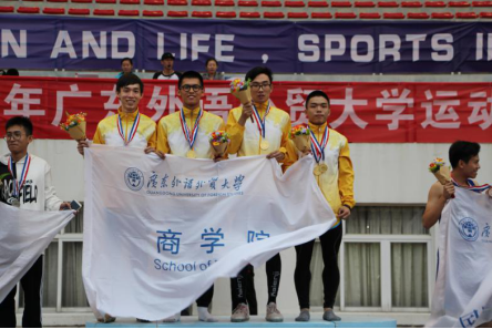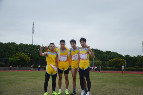 由张谦益,刘雨曦,高汉生,李锐斌组成的商院代表队角逐男子4 x100米接力决赛。一声枪响后,第一棒选手如离弦之箭,迅速获得优势,即将交接棒时,两人默契十足,第二棒选手迅速助跑,接棒,其后他瞬间加速有如破竹之势,迅速拉大与其它对手的距离,而后的第三四棒的交接动作也如行云流水。最终他们以46.10秒的成绩夺得比赛冠军,并打破校运会记录