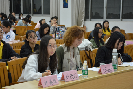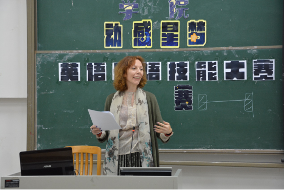 最后,外籍教师Biliana对比赛做出点评与建议。首先,她赞扬了本场比赛的三个环节的设计,她说:“第二环节让选手为电影配音,这非常棒!不仅能让大家了解外国文化,而且锻炼了同学们的地道口语发音;英语辩论赛是一个考验选手思辨能力非常好的方式,它充分展现了选手的英语综合应用能力”。随后,她还就辩论环节提出了一些个人看法并给予了选手们一些可行性建议:“现代人不能离开网络这一媒体,不然就会脱离信息,脱离社会,脱离文化”。而对于第三部分,Biliana老师在讲话中强调,无论是在学术,专业还是商业交流展示中都不能“freestyle”,选手一定要有清晰的思维网络,无论是同意这个观点,质疑或反对,都需要找论据论证,解释说明,都需要明确定义,清晰表达。演讲应该包含四个部分——“purpose”,“background”(or “explanation”),“details”,“conclusion” 。最后,她还建议任何展示都要提前做好草稿,上台时要心平气和,选手在台上时需要清楚地知道自己在讲什么,要往哪个方向讲。