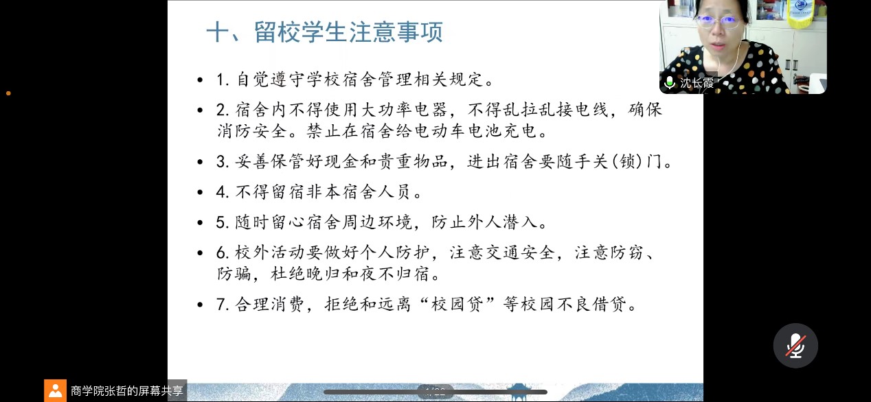 为进一步加强对留校学生的安全教育,提升留校学生在校期间的安全防范意识,保障留校学生人身财产安全,6月30日晚,bevictor伟德于线上召开2023年暑假留校学生安全教育大会,bevictor伟德全体辅导员与全体留校学生参加本次安全教育大会。会议由bevictor伟德党委副书记沈长霞主讲。