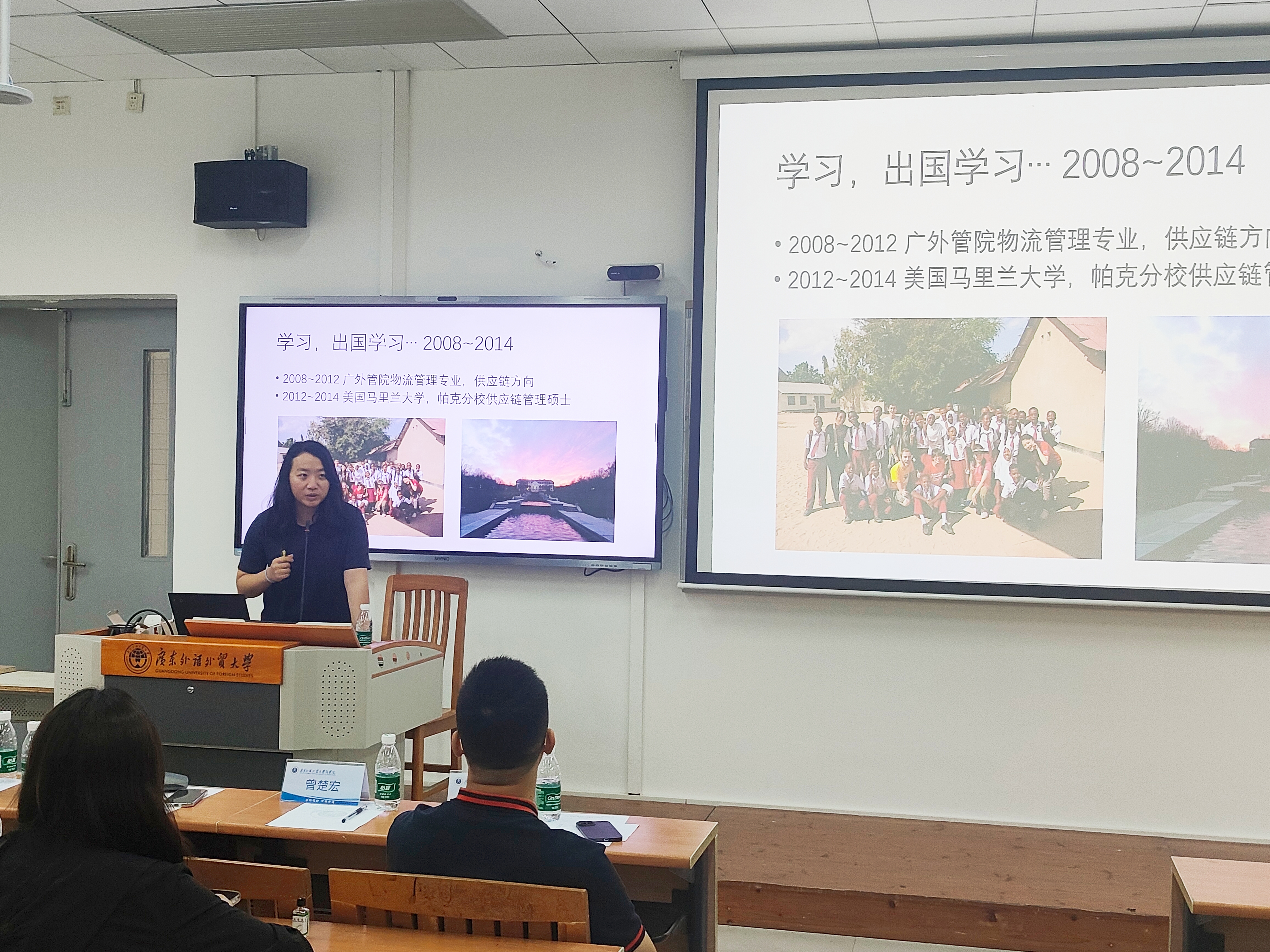 接着,马颖校友为新生进行个人经历的分享。她从个人学习、工作、生活经历等三个方面进行介绍,并强调了阅读的重要性,鼓励新生充分运用图书馆资源,同时呼吁同学们发挥广外学子特有的外语优势,培养学贯中西的思维模式,抓住宝贵的学习机会,去探索更多元的世界,从而“增加生命的厚度”。
