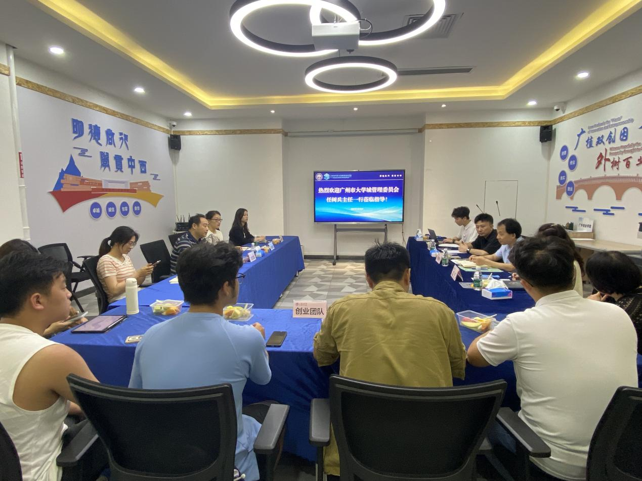 5月22日下午,广州大学城管理委员会副主任任树兵,广州大学城商会党委书记、会长、广州市番禺区智汇谷人才交流促进中心负责人陈伟,新一代人工智能产业技术创新战略联盟广州创新中心主任助理、运营总监苏宁等一行到院座谈交流,学校创新创业教育学院副院长刘方龙、创新创业教育教研室科长曹婷婷、国家级实践基地在孵注册企业代表以及相关老师参加交流。