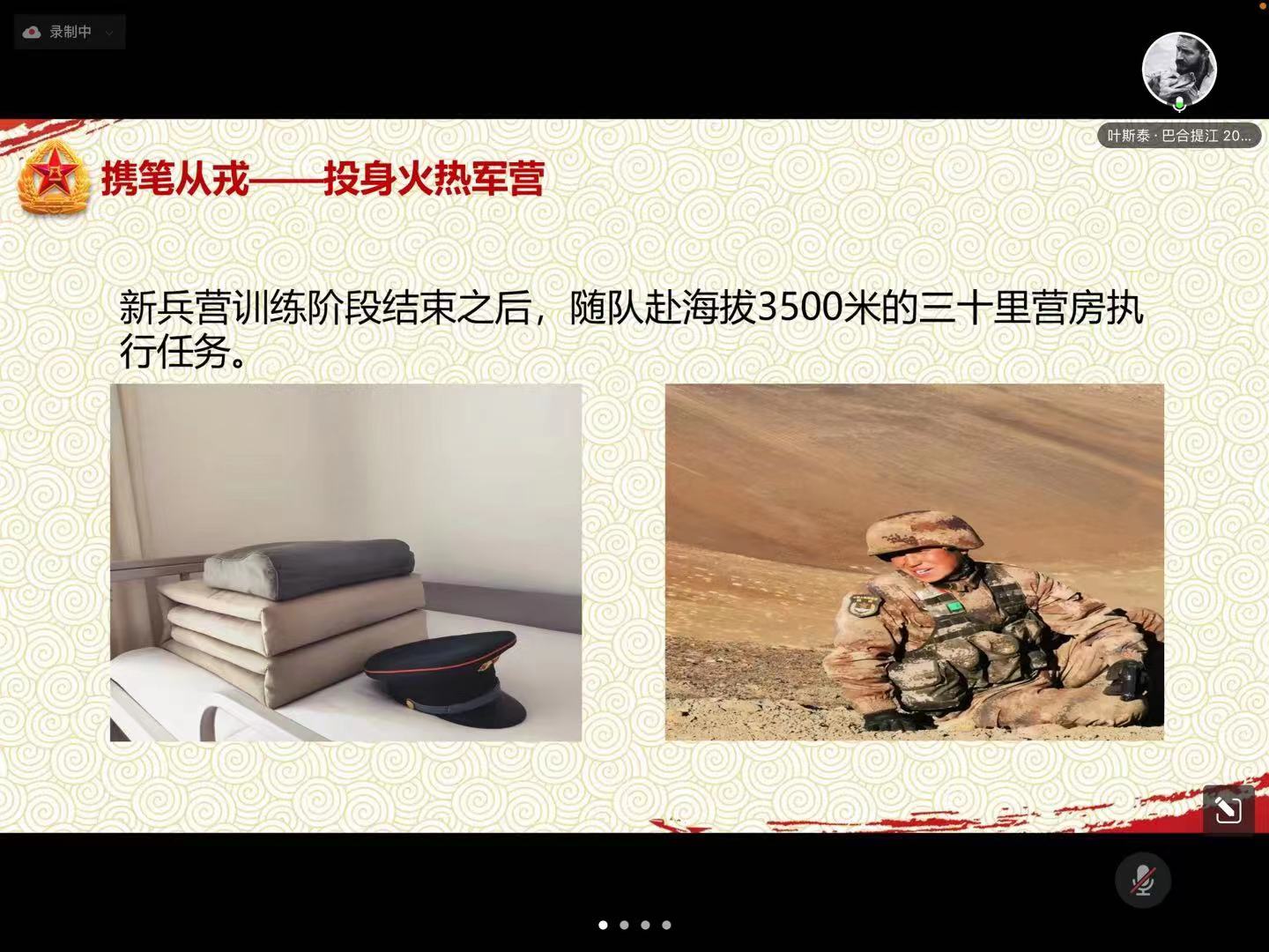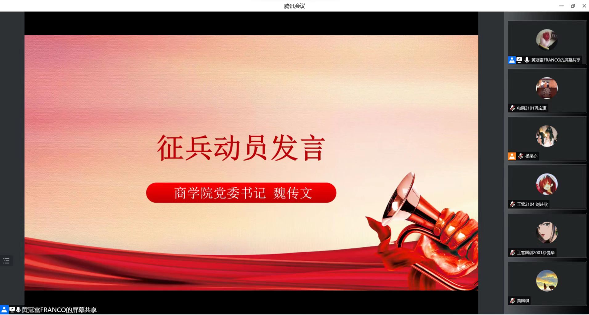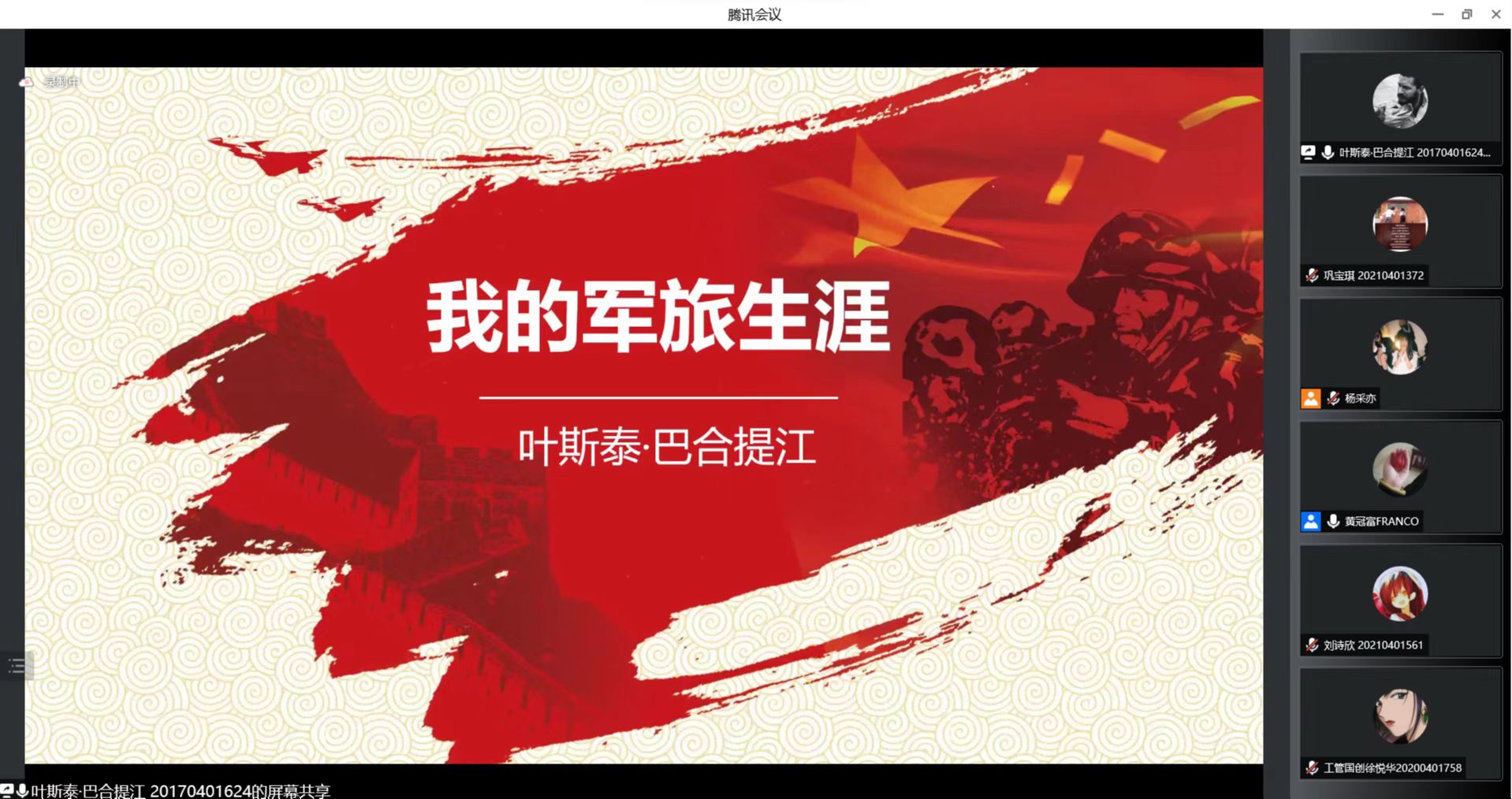 为贯彻落实国家征兵政策,鼓励在校大学生积极响应国家号召应征入伍,投身军旅,绽放青春,5月30日晚,bevictor伟德在腾讯会议召开2022年大学生征兵入伍动员大会暨政策宣讲会。bevictor伟德党委书记魏传文、党委副书记沈长霞,武装部国防教育科科长朱永海,全体辅导员、2019级退役士兵叶斯泰·巴合提江及各年级学生代表参会。