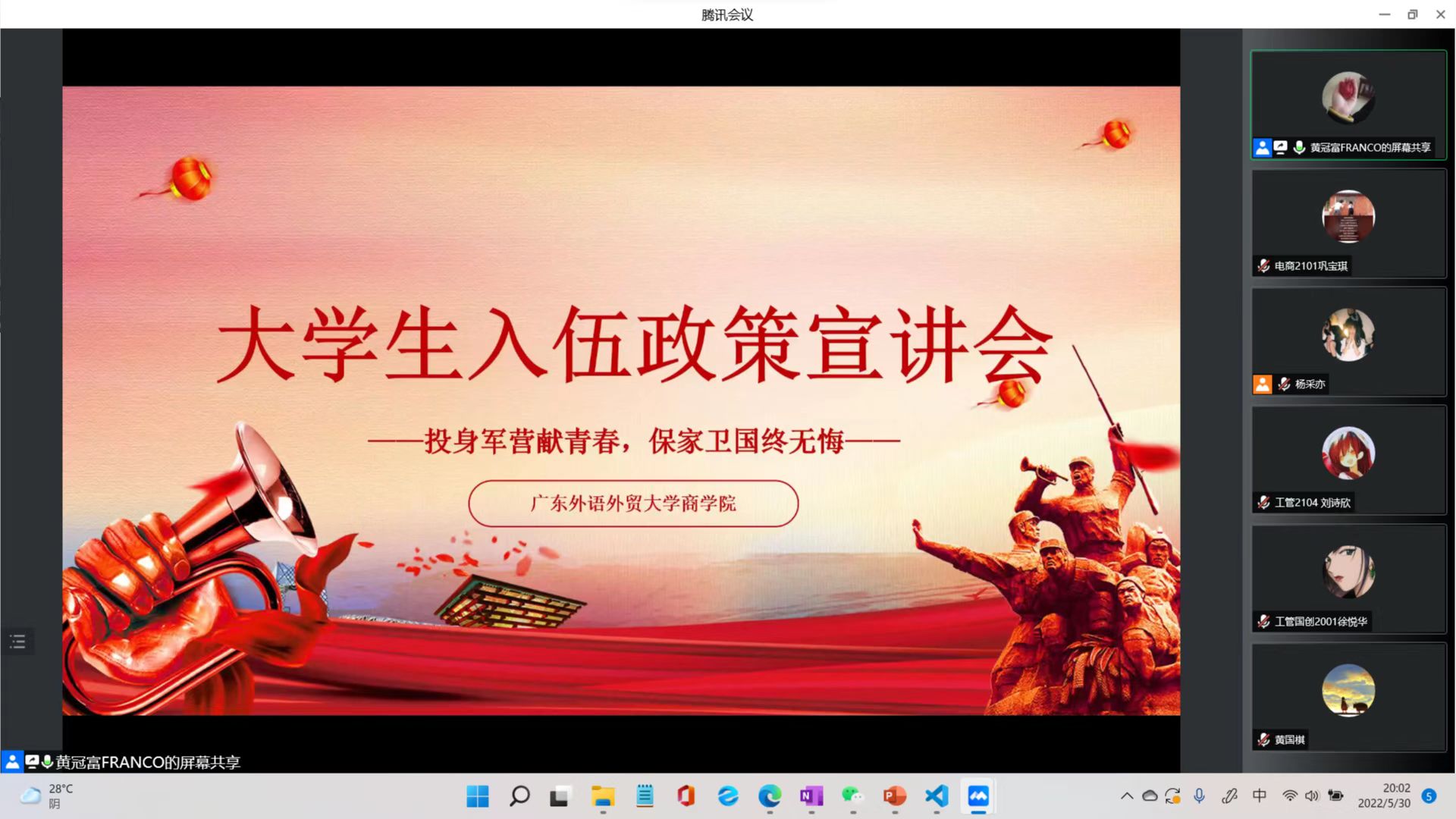 会议开始前,同学们共同观看了参军入伍的宣传片。观看完宣传片,同学们热血沸腾,纷纷在聊天框发表自己的感言,为英姿飒爽的军人们点赞。