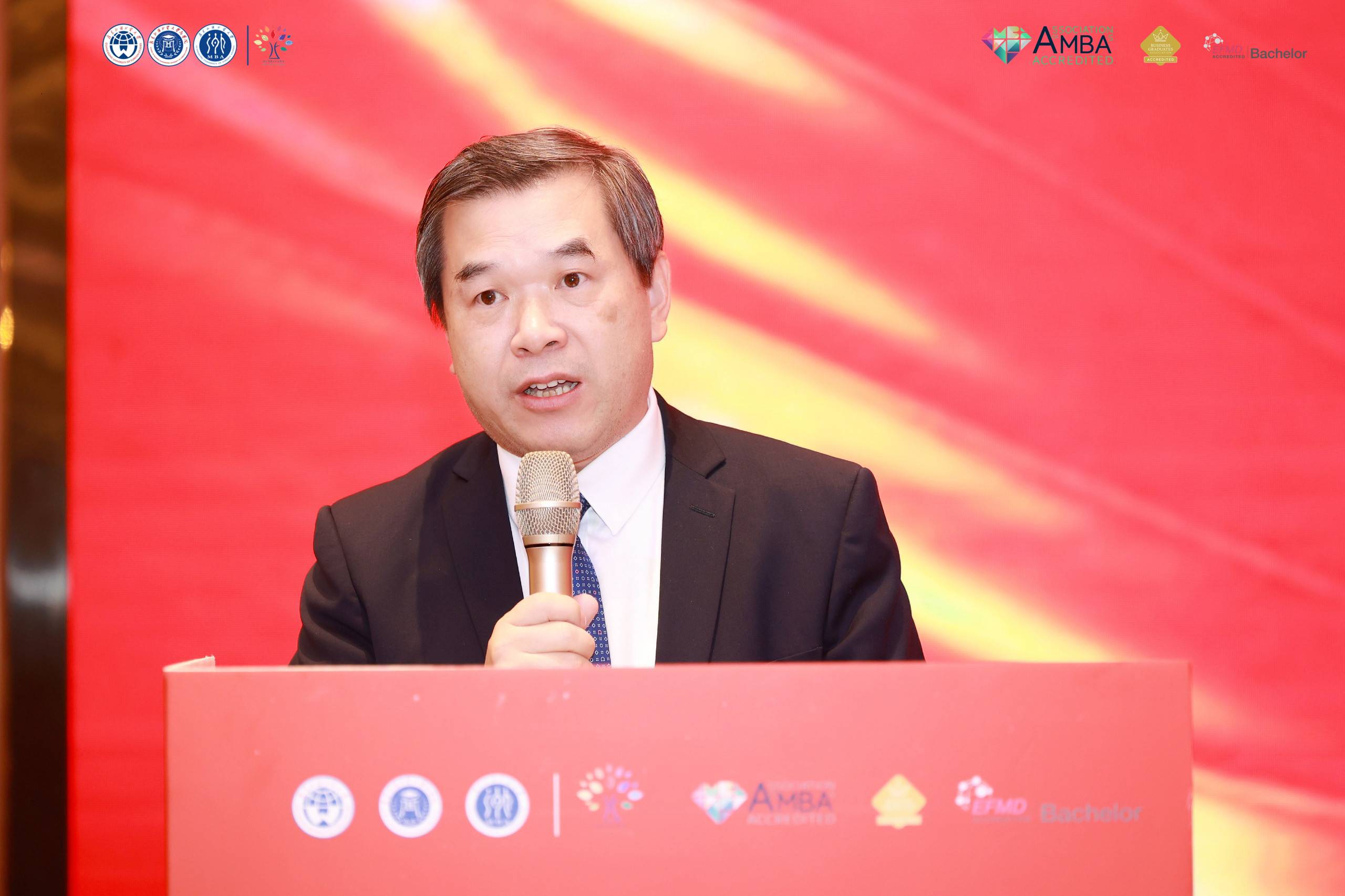 何传添代表大学致辞。他首先对与会嘉宾、校友表示热烈的欢迎和衷心的感谢。他强调广外MBA坚持“全球视野、中国商道”的办学理念,以“培养融贯中西的国际化高质量管理人才”为使命,开展了形式多样的国际交流与合作项目,赢得了广泛赞誉。他期望MBA中心持续打造“国际化”和“数字化”两大特色,紧跟国际学术前沿,传播本土商科理念,并全面提升教育和服务水平,为全体MBA学生、校友创造可持续发展平台,为bevictor伟德和学校建设添砖加瓦。