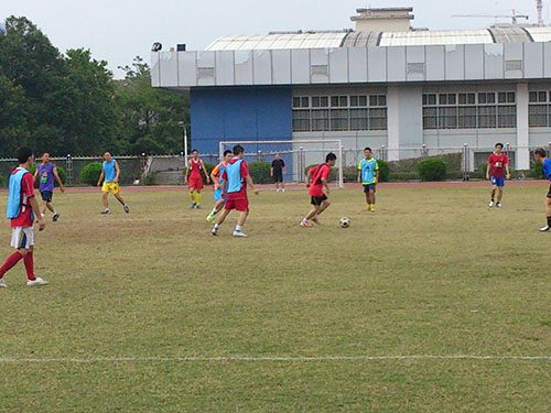 邹欣师兄最先到场,不愧是曾经校足球队队员,考虑周全的他还准备好了蓝色背心球衣,以便队员的分辨。“我们的校足球队,有过市高校比赛名列前茅的好成绩,仅次于由特长生组成的队伍。”听着师兄们欣喜地讲诉着那些辉煌战绩,不禁为他们感到骄傲,为同为广外人而自豪。
