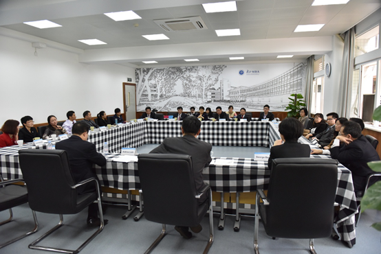 图十一:袁登华、贾佳与参加AMBA认证专家座谈的学生及校友代表合影