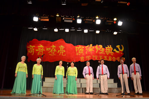 各班同学激情演出,一支老干部队伍也不甘示弱,关工委老干部合唱团为我们带来了《半个月亮爬上来》与《瑶山夜歌》。尽管已是一头白发,最大年龄者达78岁高龄,但老干部们依然用他们美妙的嗓音、完美的台风赢得观众的掌声与尖叫。