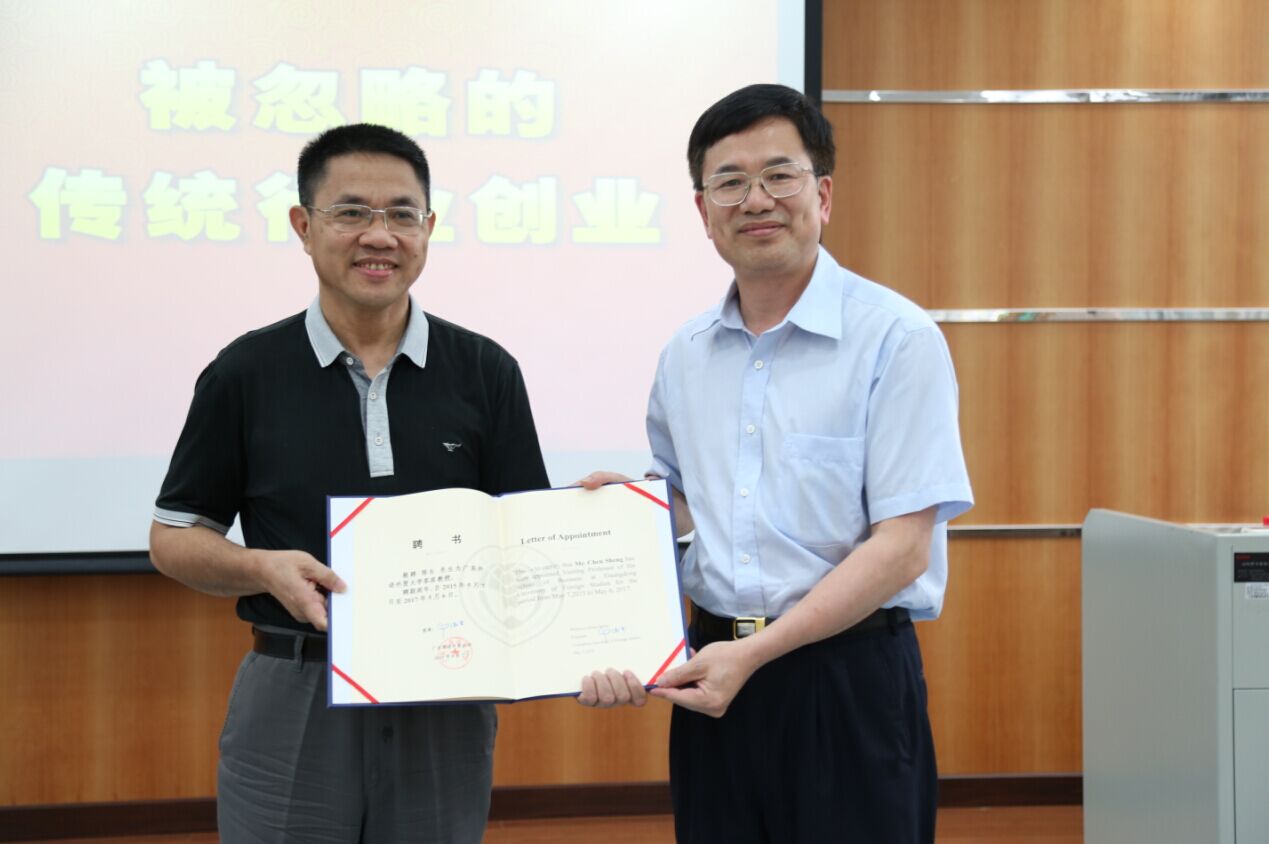 该讲座为建校五十周年系列活动之“MBA讲堂第68讲”。讲座开始前,何传添为陈生颁发客座教授聘书。