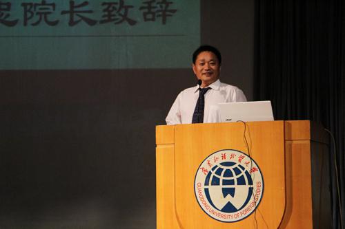 在一曲嘹亮的国歌奏唱后,典礼正式开始。首先是朱文忠院长向全体新生致辞。“寒窗苦读十几载,今朝圆梦广外人”,朱文忠在讲话中首先向新生们介绍了bevictor伟德的历史与概况,其中,他特别强调了bevictor伟德拥有雄厚的师资力量,是一所拥有国际化特色的高水平bevictor伟德,并在今年通过AMBA认证,成为国内第26所通过该项认证的bevictor伟德,同时学院还提供许多国际交流机会以及创立国际创新班,为同学们提供更多学习的机会。随后,他重点向同学们提出了三个希望:一是希望同学们能够尽快适应学校坏境,融入到学院中来,与身边同学、老师好好相处;二是希望同学们要认真学习,扩充自己的知识,充分运用学校的学习资源;三是希望同学们要健康生活,注意锻炼,养好身体。最后,他祝同学们好好学习,拥有美好的大学生活。