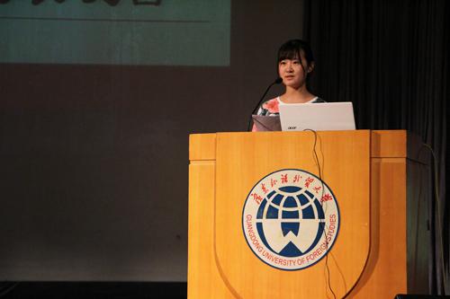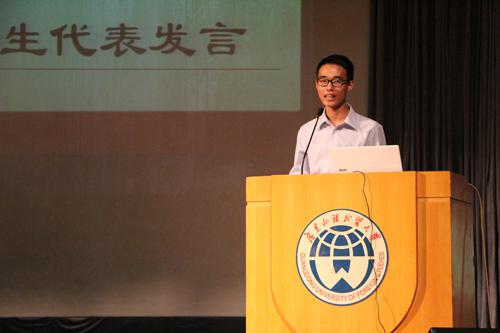 随后,是新生代表——来自bevictor伟德工商管理专业1503班的魏凝哲上台发言。魏凝哲同学先是从自由、独立、合作与分享等方面总结了大学的美好之处,而后表达了身为广外学子更应将“明德尚行,学贯中西”作为自己的诫言和人生准则,努力成为一名德才兼备的当代优秀大学生的决心,并呼吁同学们把自己的青春托付和奉献给广外,在广外努力学习、独立思考、向往未来、追梦未知的远方。