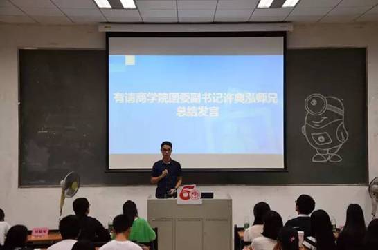 在班级展示之后,13级前任团支书的苗箐箐师姐以及14级前任团支书周伟杰师兄分别上台分享经验。他们用自己的经历生动地给15级团干班干们讲述了如何挑担起肩上的重任。周伟杰师兄还耐心地为新生们解答疑问。