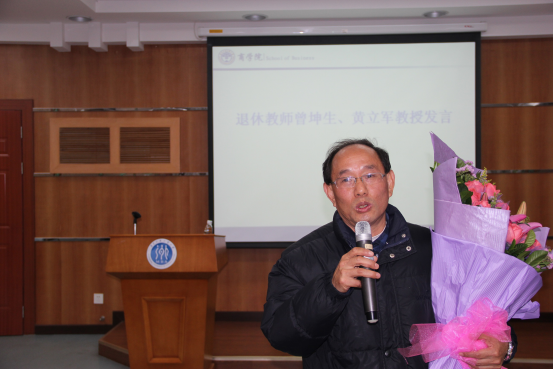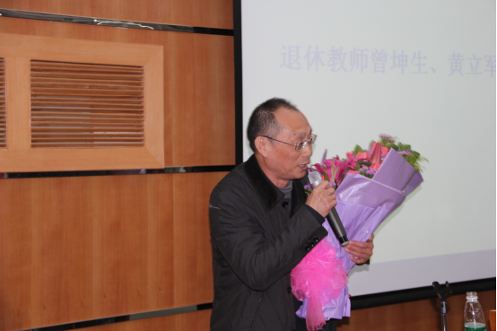 接着,两位退休教师上台发言,掀起了年终总结大会的高潮。曾坤生教授分享了十五年的教学之路,总结出“踏踏实实做人”和“坚守政治、道德、学术底线”的人生感悟。黄立军教授引用“别有一番滋味在心头”来表达自己内心的惜别与不舍,通过一个“中心”,两个“基本点”、三个“忘记”、四“要”和五“老”来表达自己对未来美好生活的憧憬。