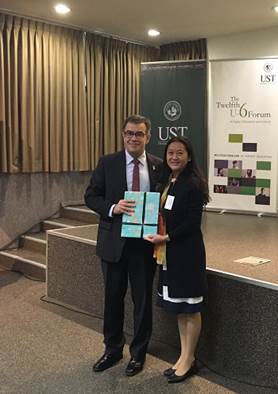 10月13日,在智利,代表团一行参加了由智利圣托马斯大学主办的第12届U6论坛,畅谈多元文化与高等教育国际化。与会期间,梁洁副院长积极跟来自圣托马斯大学、台湾岭东科技大学、台湾文藻外语学院等高校的与会代表展开互动和交流,在合作科研、本科生联合培养和教师互换等方面达成了进一步的合作意向。