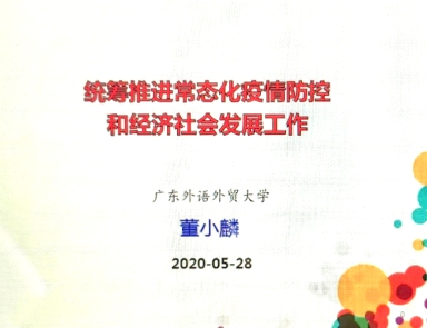 董小麟指出,当前国内主要任务是落实“六稳”“六保”,确保完成决胜全面建成小康社会、决战脱贫攻坚目标任务,必须坚持党的领导,领导干部要敢于担当,积极作为,同时要对风险因素有底线思维以及树立“危机中育新机、于变局中开新局”的辩证观。他深入解读了财政压力、就业压力、物价水平、广东发展形势等几个问题,指出目前统筹推进疫情防控常态化和经济社会发展工作任务艰巨,形势严峻,同时也有乐观一面;要脚踏实地,落实“六保”任务解决应届毕业生就业问题,扎实推进特殊时期产学研各项工作。