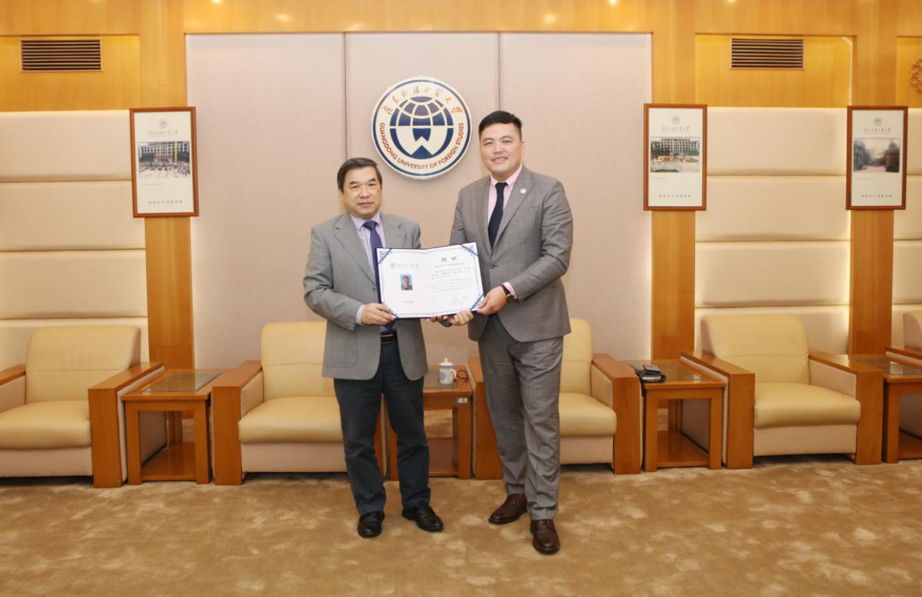 云山讲座教授聘任仪式在北校区行政楼迎宾厅举行,焦方太副校长代表大学为沈伟颁发聘书。