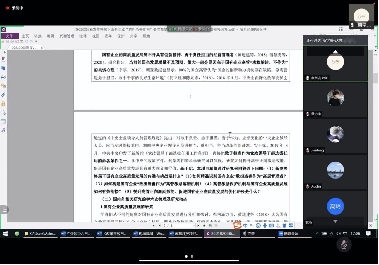 首先袁方老师对准备的国家社会科学基金项目课题进行介绍,重点突出了研究问题,研究意义,明确了研究对象是国企高层管理者,清晰概述了研究思路、研究内容和研究目标。会议上各位老师提出了不同的意见和建议,归纳为以下几点:一是增加课题题目的准确性与精简性;二是提高对课题定位和角度的把握能力;三是优化具体研究问题的逻辑思路方面;四是提高文献梳理能力,使其更为简洁。另外各位老师就理论基础是否合适,统计方法是否严谨,自变量定义是否准确等展开了讨论研究,对课题进一步的完善和提升提供了很大的帮助。