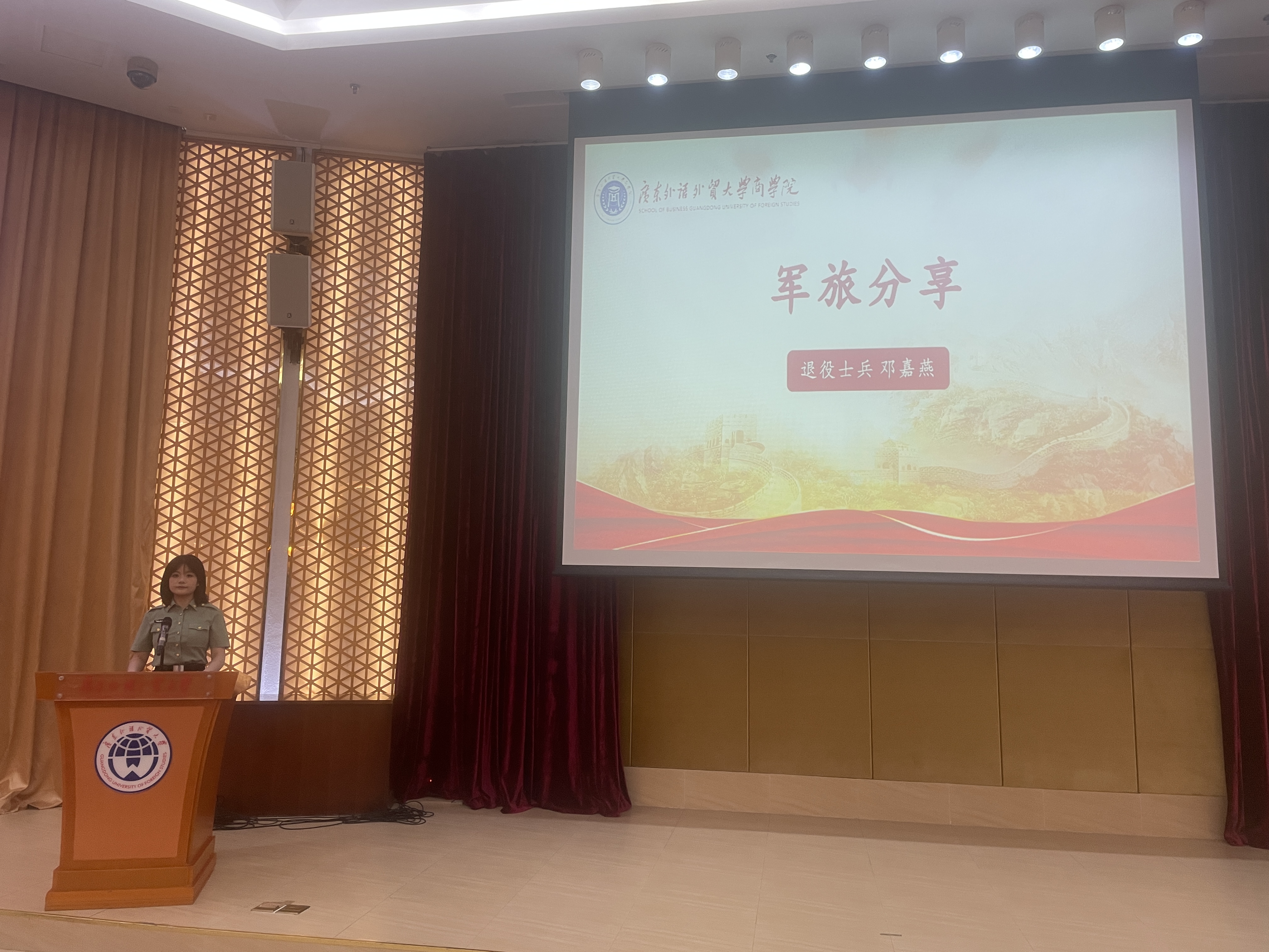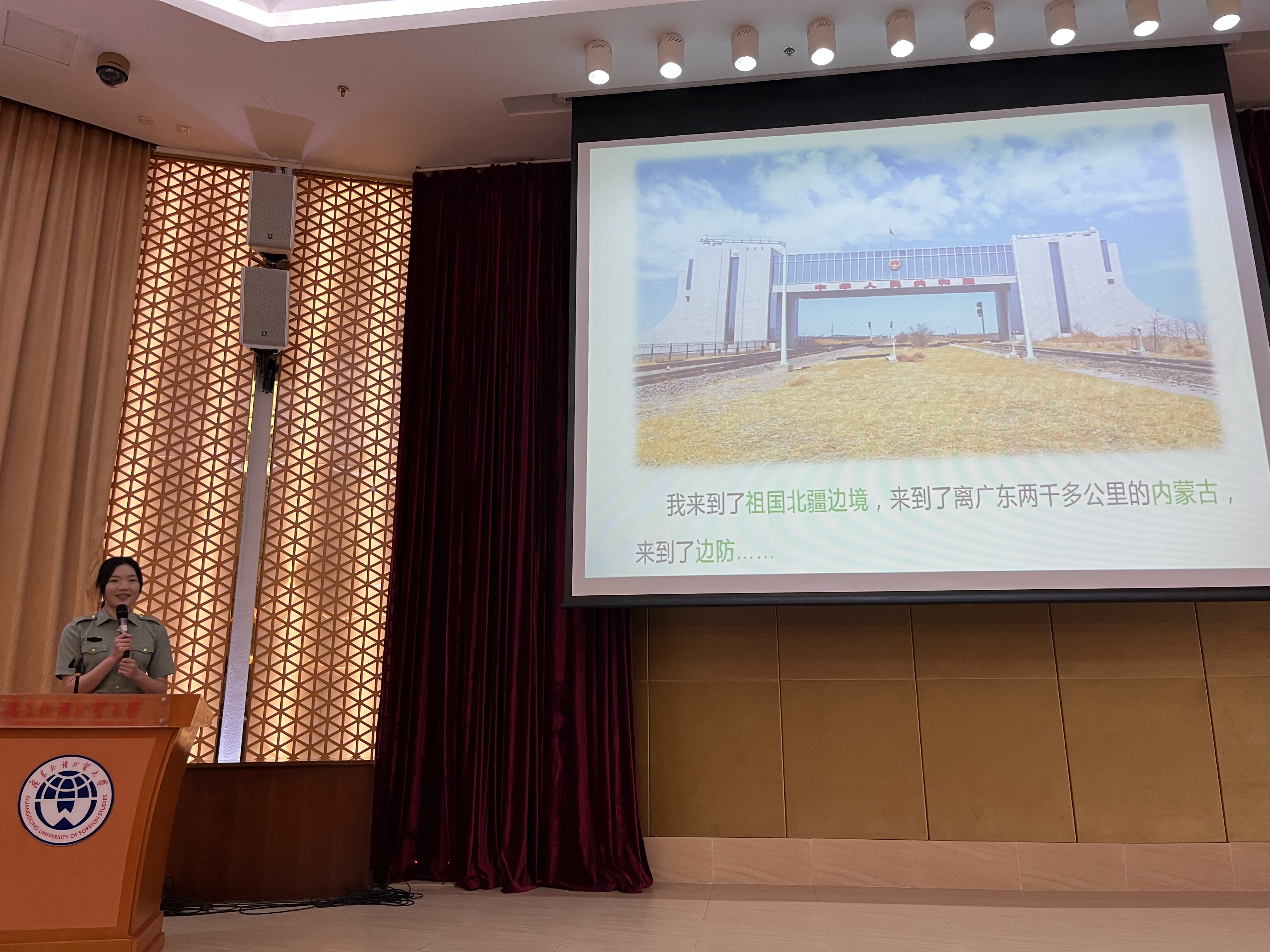 随之,英文学院退役士兵陈慧珊为同学们分享了她的军旅生涯,从训练生活和文艺活动两方面讲述了自己两年的北疆边防之旅。巾帼不让须眉,从新兵三月到新兵下连,身上的伤痕见证了她从一名青年到军人的转变。岗位就是战位,在部队中,陈慧珊努力钻研通信知识,刻苦训练,在考核中打破了单位记录,荣获第一名。她表示,作为青年,应该勇于尝试,不要害怕踏出舒适区。最后,她鼓励同学们有梦就要勇敢去追,将青春融入祖国国防建设,融入强军梦。