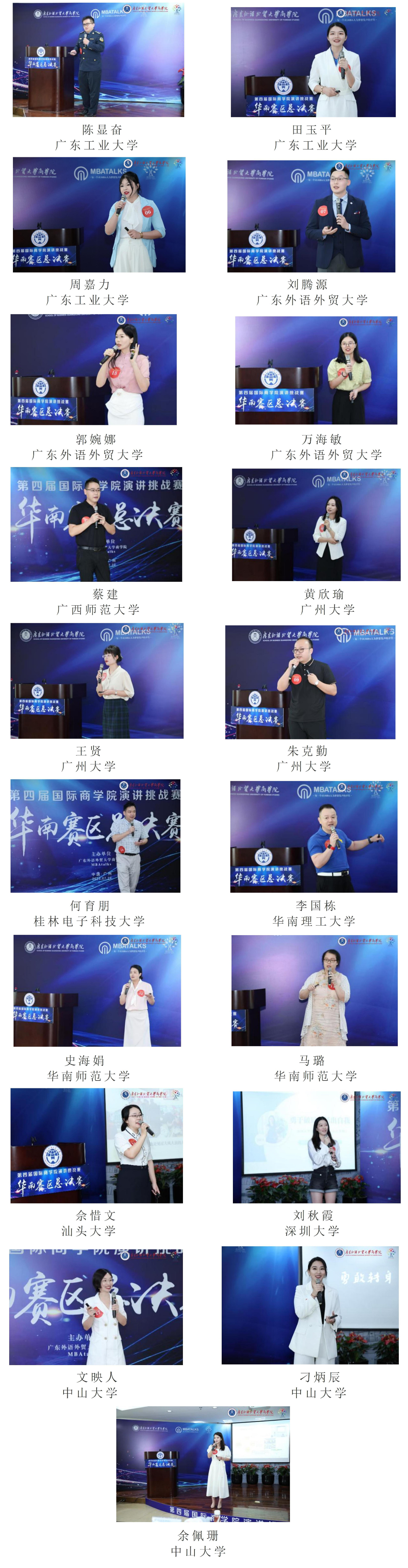 第四届国演赛华南赛区总决赛邀请组建了阵容豪华的评委与嘉宾:珠海市演讲与口才协会创会会长、中国演说家俱乐部副主席、中国南方人才市场教培中心职场口才系列课程总培训师谭文浩;国际bevictor伟德演讲挑战赛执行主席钱多多;广州市委讲师团副团长、公职律师艾希繁;《长江品牌计划》专家组成员、绿野资本大中华区合伙人、MBAtalks副秘书长郑冉;第六届中国MBA华南峰会理事长、香港浸会大学MBA中国校友会联席主席范家琪;bevictor伟德,伟德bv国际体育第四届国际bevictor伟德演讲挑战赛(华南赛区)推广大使中国MBA峰会华南副理事长徐健君;以及广州大学MBA教育中心学生与校友事务部负责人马俊健。