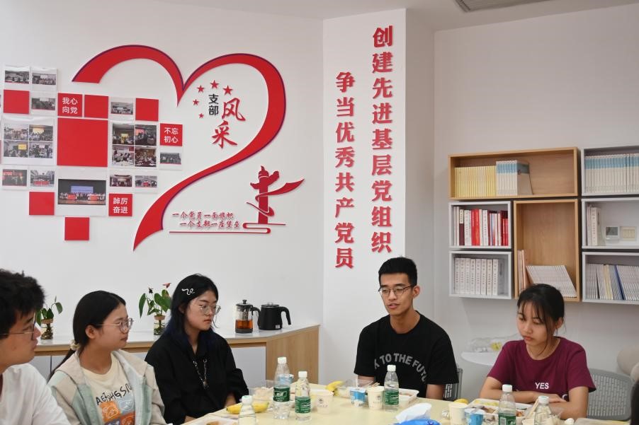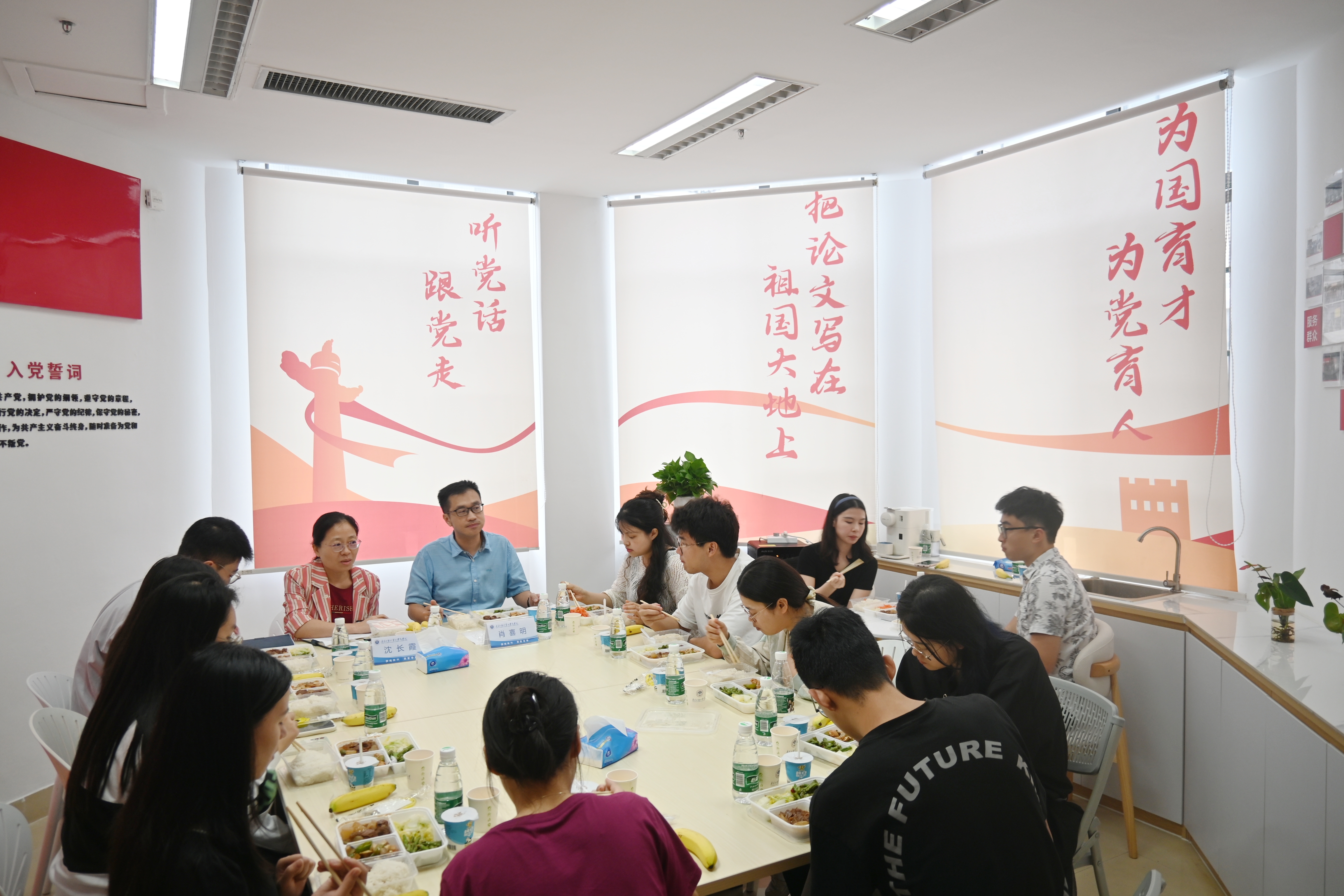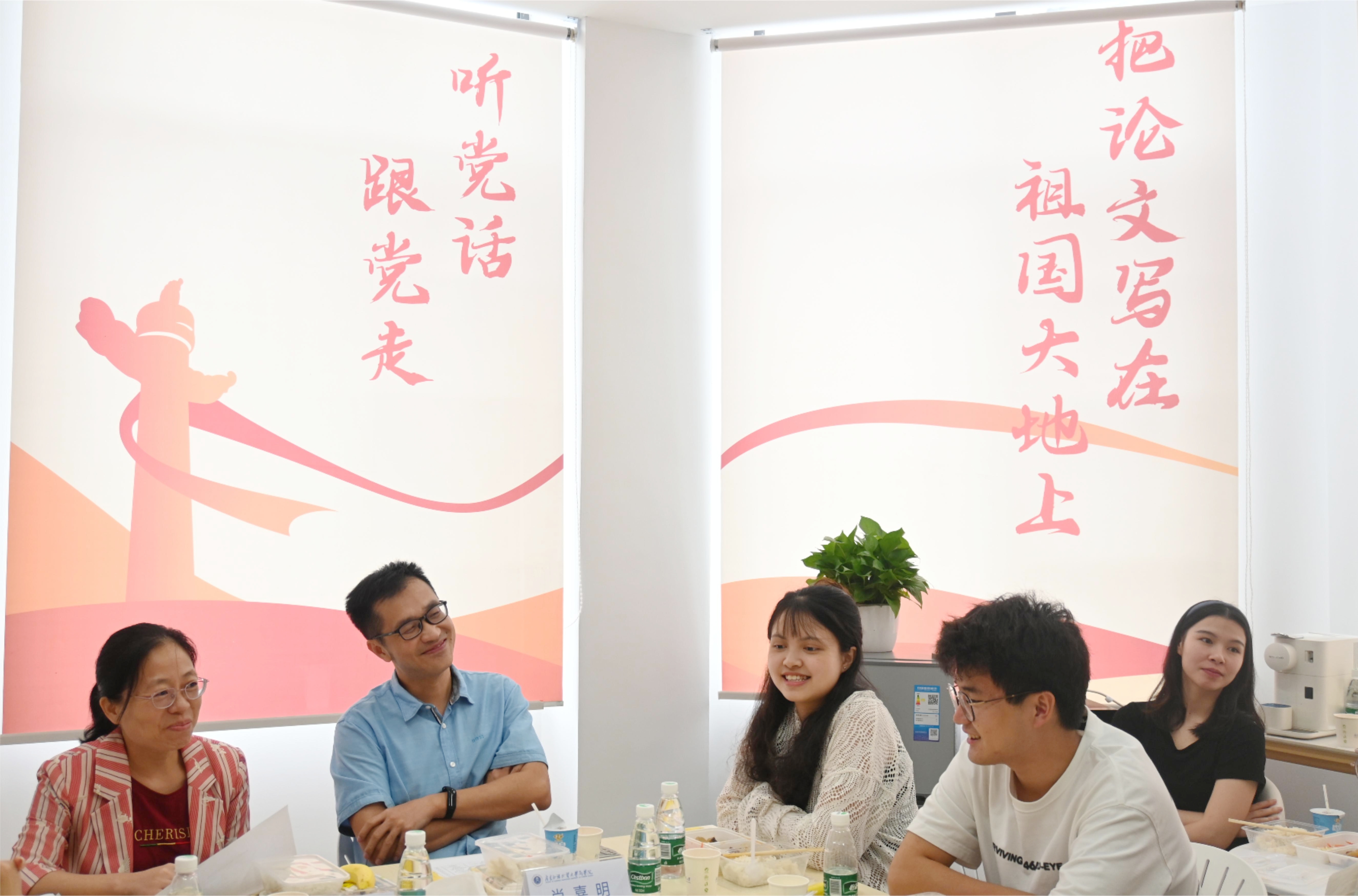 午餐会上大家边吃边聊,氛围轻松愉快。同学们围绕自己的学习生活、个人规划、学院建设等话题进行深入交流。马丽娅提出了自己作为大一新生的迷茫和焦虑,与会老师和学长学姐们暖心鼓励其调整心态,从小事做起,在过程中明确目标、提高能力;刘丰源、许馨予就身边同学提到较多的宿舍设施、用水用电等问题提出了意见与建议;王昭程和耿智分享了自己担任学生朋辈导师的经历和收获,提出了班级凝聚力建设等方面的疑惑;罗蓉琪提到了毕业班同学在求职就业中遇到的困难,希望学院能够在教学中融入关于专业学习和就业岗位适配性的介绍,提供更有针对性的职业生涯规划指导。肖喜明和沈长霞逐一回应并解答了同学们提出的问题,勉励同学们利用好学校和学院的资源,努力学好专业知识,在实践中提升本领,提前做好生涯规划,找准未来发展方向,努力成长为堪当民族复兴重任的时代新人。
