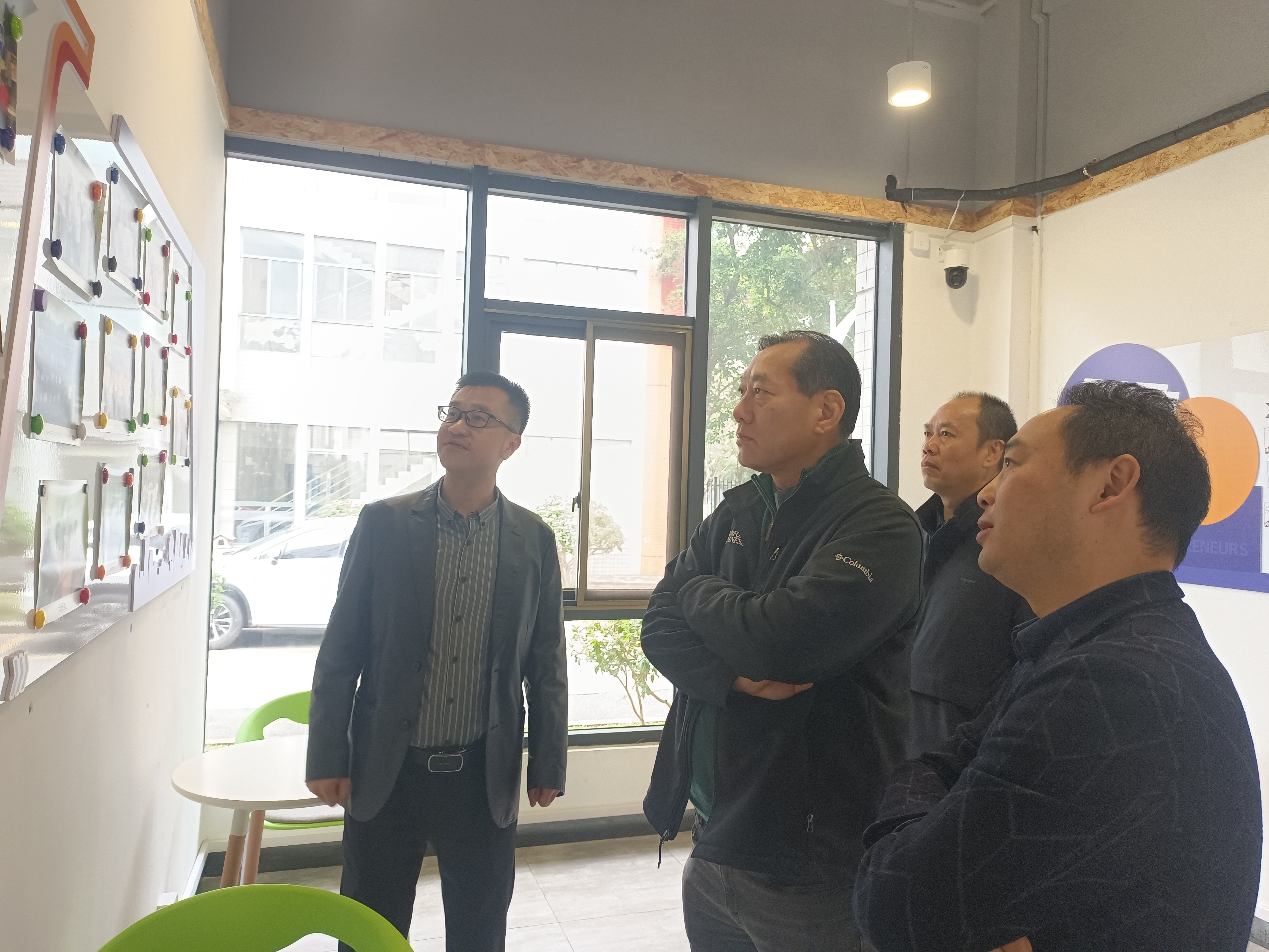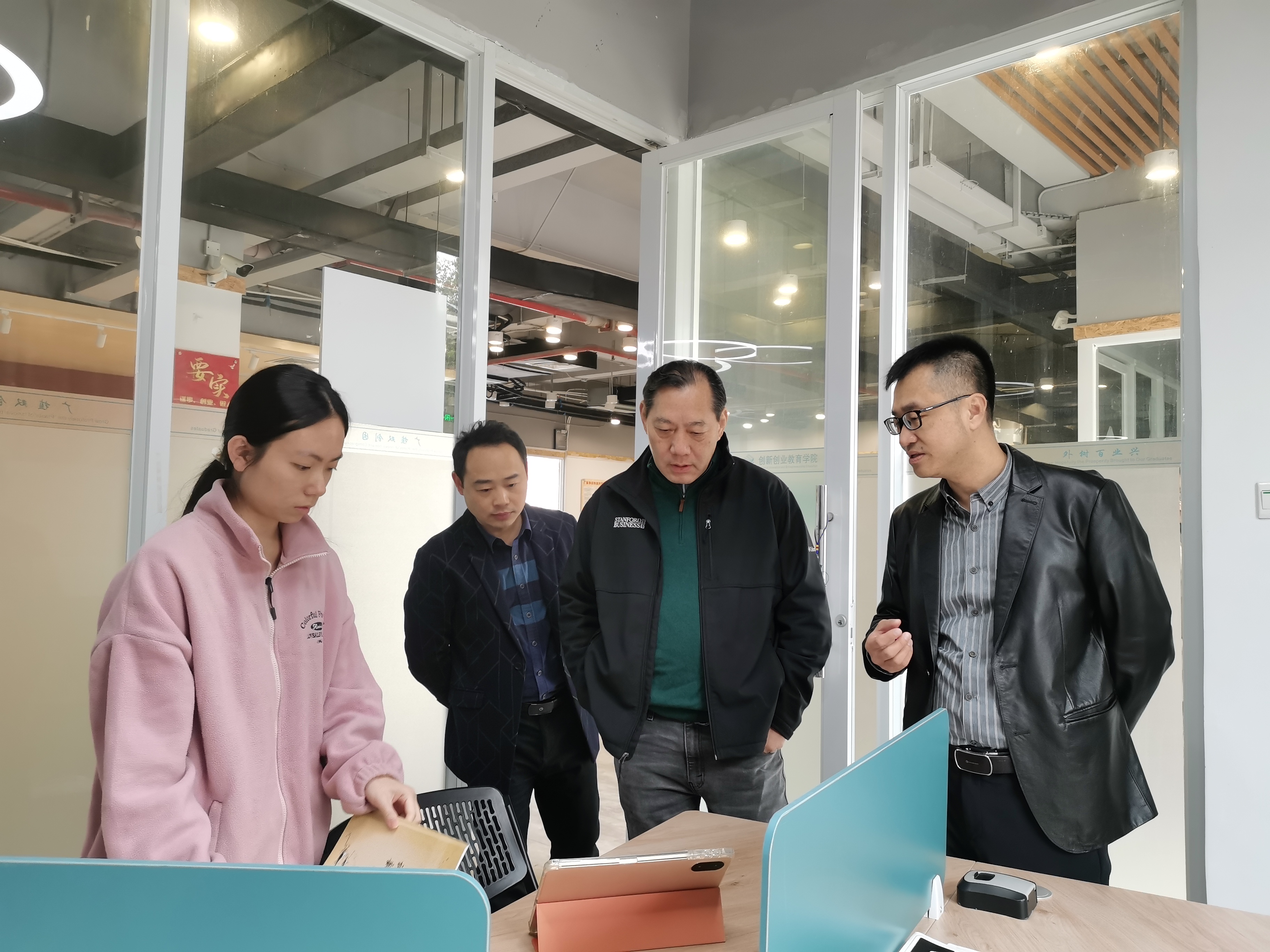 随后,肖喜明带领校友实地参观国家级创新创业教育实践基地,走访基地各功能活动区域、创新创业团队入驻和创新创业实践活动情况。曾德祥与bevictor伟德师生创新创业团队“奇奇星”“译心筑梦”“木木科技”进行交流,深入了解学生创业项目,并结合自身经历和企业业务,对bevictor伟德学生创业团队开展创新创业项目发展提出宝贵建议。