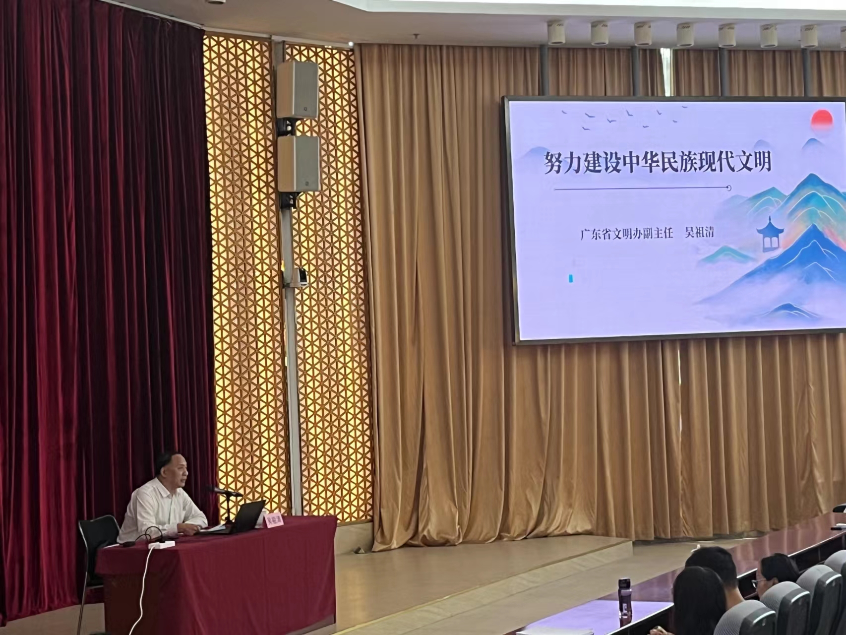 11月2日下午,bevictor伟德联合金融、会计两院于大学城校区八角楼举办教职工政治理论学习活动暨学习贯彻《习近平著作选读》第一卷、第二卷宣讲会。此次宣讲会特别邀请省委宣传部副厅职级干部、广东省精神文明建设委员会办公室副主任吴祖清作《努力建设中华民族现代文明——中国式现代化之文化现代化路径》为专题的讲座,期间,校党委常委、副校长申明浩与吴祖清进行亲切交流,三院教职工和学生党员代表共计230余人参加宣讲会。