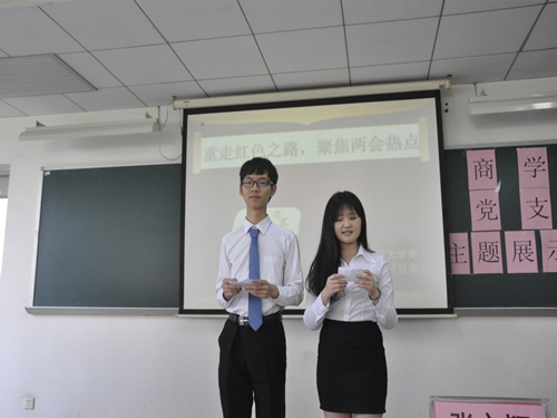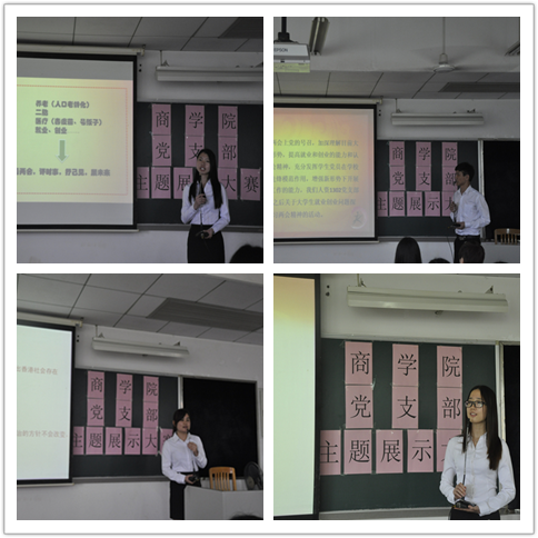第五位进行展示的是14级物流党支部 ,该党支部成员通过观看记录中国共产党艰苦创建历史的电影《建党伟业》开展学习活动,在观影后撰写观后感以缅怀先烈,激励奋进。而后上台展示的14级管理党支部,通过一出情景剧,表达了对医疗改革问题的热切关注。通过对医生、病人角色扮演的采访,让大家看到了医疗改革中存在的部分问题,体现了对推进医改的强烈渴望。