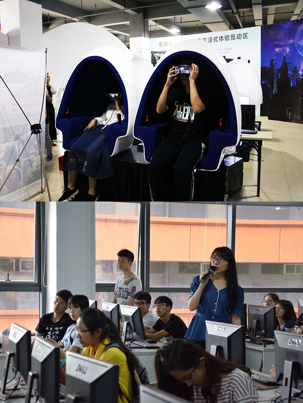 下午,原本晴朗的天气突然下起了大雨,雨水使原本燥热的天气凉爽了起来,却浇不灭同学们参观深圳华夏动漫科技有限公司的热情。华夏动漫科技有限公司是国家重点文化出口企业。《憨八龟》这部出口到多个国家的原创动画片就是出自华夏动漫之手。其中,最让人惊叹的是华夏动漫创造的原创虚拟偶像——紫嫣Violet,通过全息3D投影技术,紫嫣这一个虚拟的偶像可以达致逼近真人的舞台效果。体验区的VR头戴式游戏设备体验更是令同学们热情高涨,大家纷纷戴上设备。通过3D显示、体感交互及显示增强技术的结合,使得同学们在玩游戏的过程中仿佛身临其境,欲罢不能。