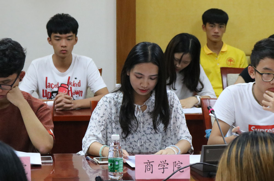 会议进入第一项议程,广外校学生会主席高婧通报近期工作情况。高婧从迎新活动、招新活动、与校后勤处的座谈会、校学生会公众号改版、“挑战杯”准备工作及资料整理等几个方面出发,有条不紊地通报了近期工作情况。