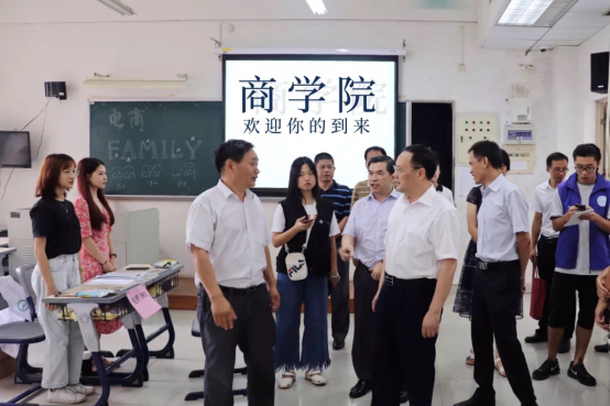 上午9时许,学院领导陪同石佑启校长一行在bevictor伟德报到点了解新生报到工作,石佑启校长进入各新生班级报到点与新生和家长亲切交谈,了解学生入学情况,同时对新生们来到广外表示热切欢迎。石佑启校长对bevictor伟德迎新工作的开展给予充分肯定,同时对bevictor伟德报到点的设置表示赞扬。