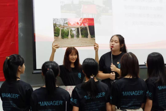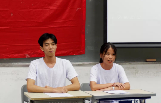 第三个展示的是工管1909班。该班没有像其他班级一样借助多媒体播放背景音乐,而是由班内同学现场吉他伴奏,动听的吉他声第一时间吸引了所有人的注意。伴随着悦耳的吉他声,班长带领同学们回顾了该班的团日活动:晨跑、摄影展、参观广州起义烈士陵园和广州地铁博物馆等。随后该班以情景剧的方式再现了团日主题班会现场,歌唱《我和我的祖国》、朗诵爱国诗篇、用小纸条写信给70年前的先烈……风趣幽默的表演赢得了台下阵阵喝彩。最后,杨欣老师点名表扬该班班长李欣雨,称其准备充分,应为所有人之榜样。