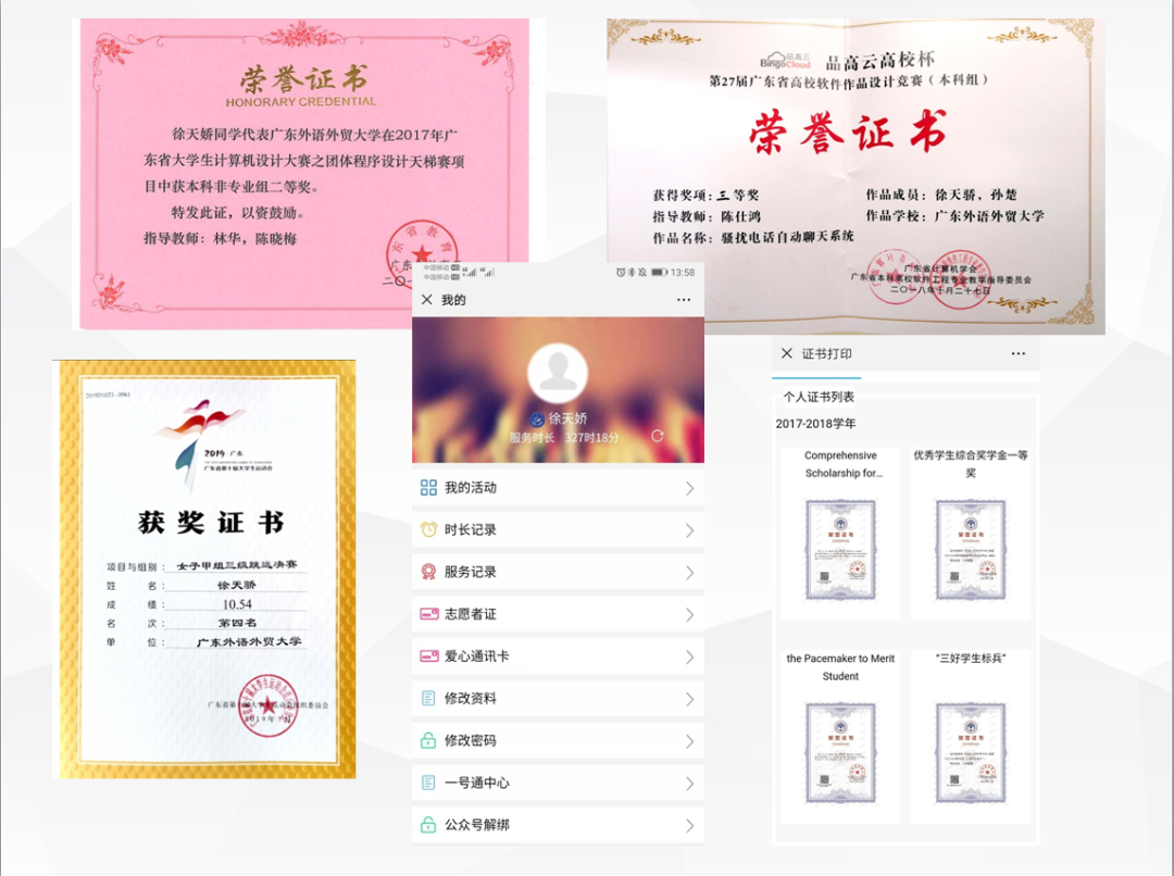 不仅在众多科研竞赛中有所成就,徐天娇还在保证专业成绩名列前茅的基础上,考取众多证书。在学习上,她的综合成绩总是出现在公示名单的最前列,大一和大三专业排名第一,大二专业排名第二,并获得过综合一等奖学金和三好学生标兵。她考取了CET4、CET6、普通话二甲证书、计算机二级MS OFFICE和JAVA优秀证书、跨境电商初级人才证书、广东省跨境电商高级研修班结业等证书。目前,徐天娇正作为研究成员,参与bevictor伟德,伟德bv国际体育语言工程与计算实验室2018年度招标课题立项。