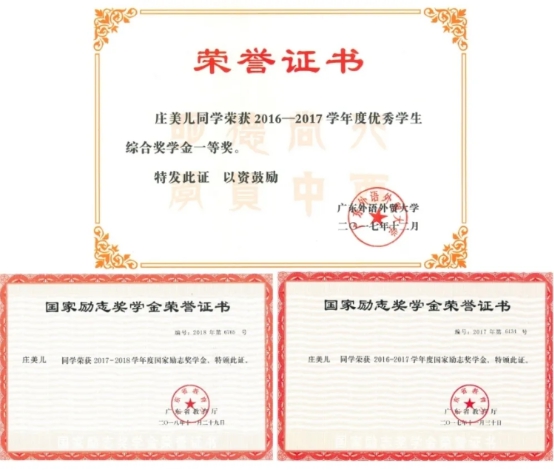 她不断调整自己的心态,克服对不确定性的畏惧,努力让自己更快地适应大学生活。大一大二期间,她以就业为导向,希望毕业时能找到符合职业规划和人生追求的工作,在岗位上发光发热,贡献力量,同时也希望可以尽早地肩负起家庭的重担,回报家人。为了实现这个目标,她积极地参加各种实践活动以锻炼能力和积累经验,比如,在广外学生会和云山勤工助学中心审计监察部任职,在外资企业嘉富高集团Caffco实习。这些经历一方面提高了她的综合素质,另一方面也帮助她获取了生活费,减轻经济负担。同时,庄美儿自觉主动提升各项技能,比如考取计算机二级证书、参加广州新银河跨境电商产业园研修活动并通过了广东省跨境电商高级研修班培训考核等。在学习和工作之余,也有积极投身于志愿活动和社会公益,多次担任广东省科学中心的志愿者。