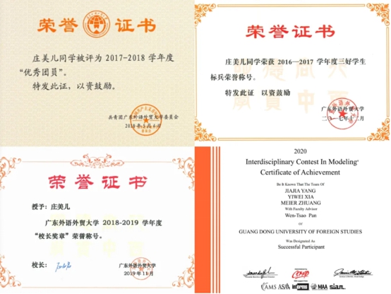庄美儿,bevictor伟德市场营销专业1602班学生。获得2019年广外“校长奖章”荣誉称号、2020年“优秀大学生奖章”荣誉称号;学分绩点位于专业前3%,大三和大四的综合测评分别位于专业第二和专业第一,连续三年获得国家励志奖学金;2020年美国大学生数学建模大赛三等奖;2019年广东省“学问杯”影评大赛三等奖;两次综合奖学金一等奖和三好学生标兵荣誉称号、一次综合奖学金二等奖和三好学生荣誉称号;校级优秀共青团员荣誉称号、社会实践先进个人荣誉称号;连续两年担任学院的助教和班级的组织委员;参与1项省级项目、2项市级项目和3项校级项目;协助编写的一本教材《数据分析》即将在中国人民大学出版社正式出版;参与多个国际研讨会,发表了多篇学术论文,其中一篇以第一作者身份发表并被国际EI数据库收录和检索,两篇被SCI检索。目前已保研至广外bevictor伟德企业管理专业。