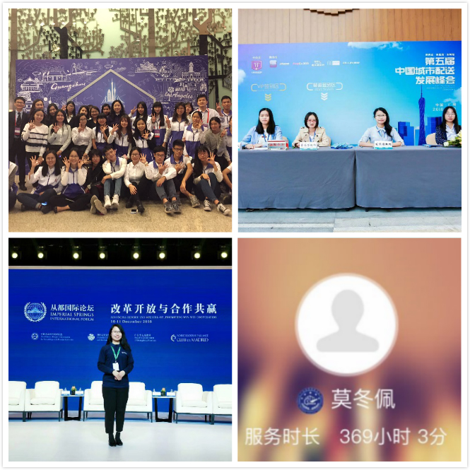 志愿服务是莫冬佩的大学生涯名片之一,三年来她参与了28个志愿活动,拥有了369小时的故事。因志愿服务结缘的伙伴们对她产生了深远的影响,并参与、见证了她大学中的很多重要抉择。从最初单纯的服务初心,到志愿服务项目大赛获奖,到组织策划志愿活动,到在中俄人文合作交流委员会上与中俄双方总理握手,到在三城经济联盟广州年会与奥斯卡金像奖得主查理德泰勒对话,到在从都国际论坛上听联合国前秘书长潘基文谈国际关系。莫冬佩不断在学习中实践,在实践中学习,从点到面,这是一个阅历、见识的蜕变过程。