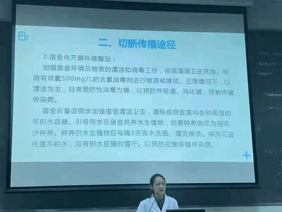 培训会上,黎敏医生从传染病的定义、法定传染病分类、传染病的特征、传染病流行过程、传染病的防控原则、学校重点防控传染病及防控措施对防疫及急救知识六方面介绍了宿舍卫生防疫安全工作,引导同学们创造更加安全舒适的生活空间;乔靖老师从宿舍常见的安全问题进行讲解,并指出宿舍安全是宿舍生活的重中之重,明白与传达正确的安全条例、培养宿舍成员的安全意识是宿舍长的重要职责;黄燕平老师从宿舍长的工作职责、如何利用沟通技巧化解宿舍矛盾、如何识别大学生常见异常心理、如何预防心理危机的发生等方面进行讲解,指出集体宿舍生活中,宿舍长不仅关心安全问题,更要关心宿舍成员的心理健康;谢铭威老师从宿舍长职责、制定宿舍公约、谨防违纪行为、遵守防疫规定等方面进行讲解,指出良好的宿舍氛围会产生1+1+1+1>4的效果。黄锐同学为同学们介绍了学生宿舍自律委员会、宿舍长、楼层长的工作及职责,呼吁同学们和自律会共同建设良好宿舍环境,营造良好的宿舍氛围。