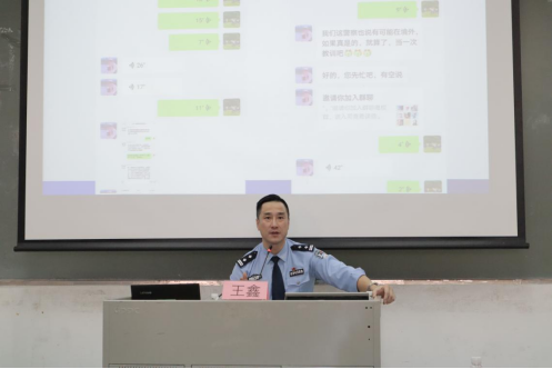 紧接着,王鑫警官进行了反诈宣讲。首先,王警官结合对诈骗案件的分析,强调提高反诈骗意识刻不容缓。随后,王警官详细介绍了电信诈骗的特点和一些常见的诈骗类型,如购物诈骗、网贷诈骗、投资理财诈骗、刷单诈骗、网络交友“杀猪盘”诈骗、冒充熟人诈骗等。王警官结合丰富的真实诈骗案例,以情景教学的方式教导同学们如何辨别诈骗手法、如何更好的防范诈骗,并提醒同学们要注意网络交友陷阱、不随意下载视频软件、警惕诈骗电话、远离刷单行为和校园贷等。最后,王警官再次提醒大家要注意个人信息的保护,如家庭住址、身份信息、快递信息、手机验证码等,并介绍了反电信网络诈骗专用号码“96110”的重要作用。讲座期间,王警官语言生动幽默,与现场老师同学频频互动,同学们聚精会神,深有启发。