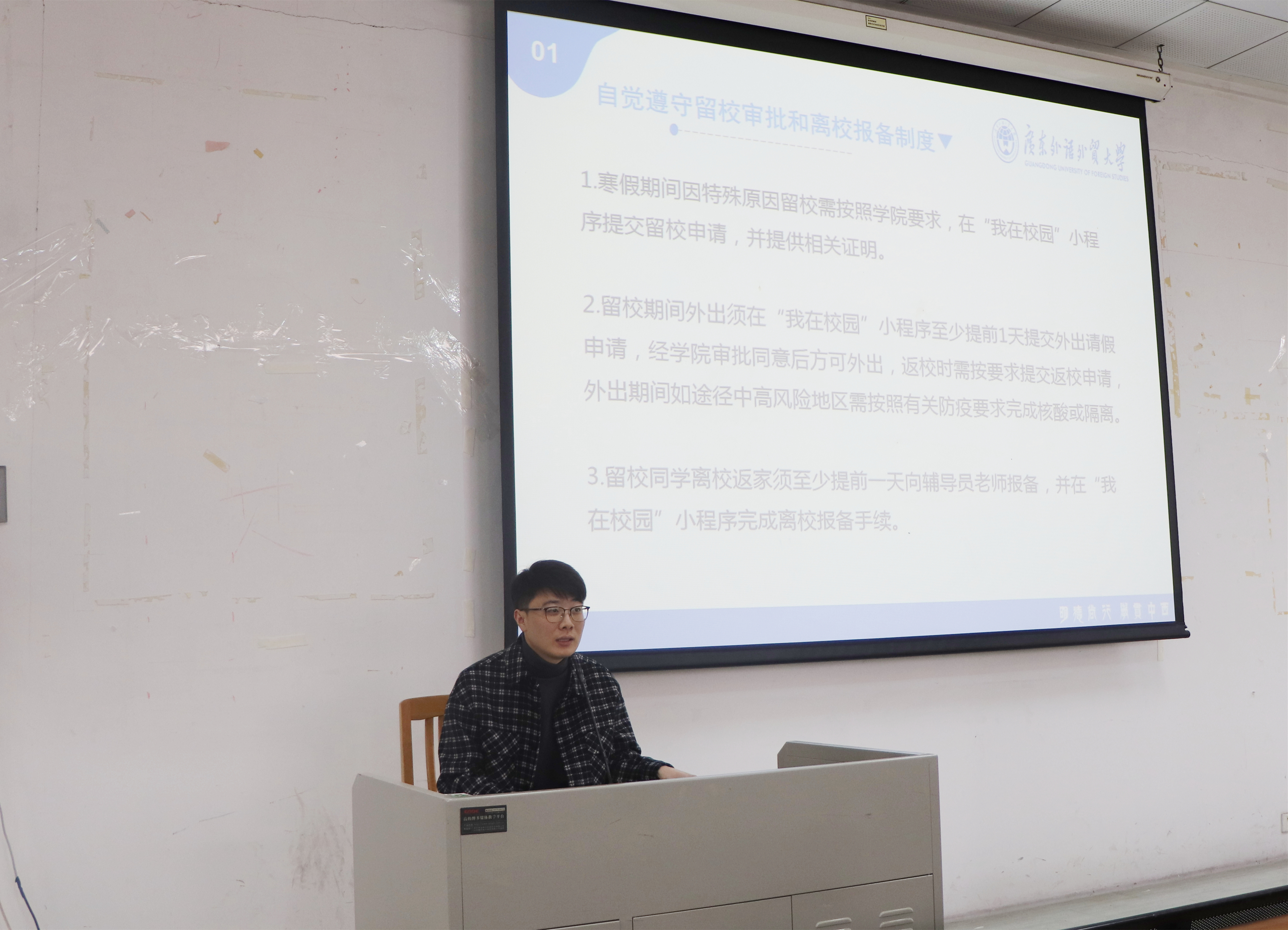 随后,辅导员张哲从留校审批和离校报备制度,疫情防控和宿舍管理规定,防火、防盗、防诈骗,校外实习和实践,合理安排假期生活等方面,向同学们详细讲解了留校期间的注意事项。他提醒同学们要增强纪律意识和规则意识,自觉遵守学校的疫情防控管理规定和宿舍管理规定,提高反诈骗意识,外出实习要注意交通安全、做好疫情防护、保证好个人人身和财产安全。同时,叮嘱同学们合理安排假期生活,养成健康的生活方式,调节身心健康,制定适合自己的学习计划,努力增长才干。