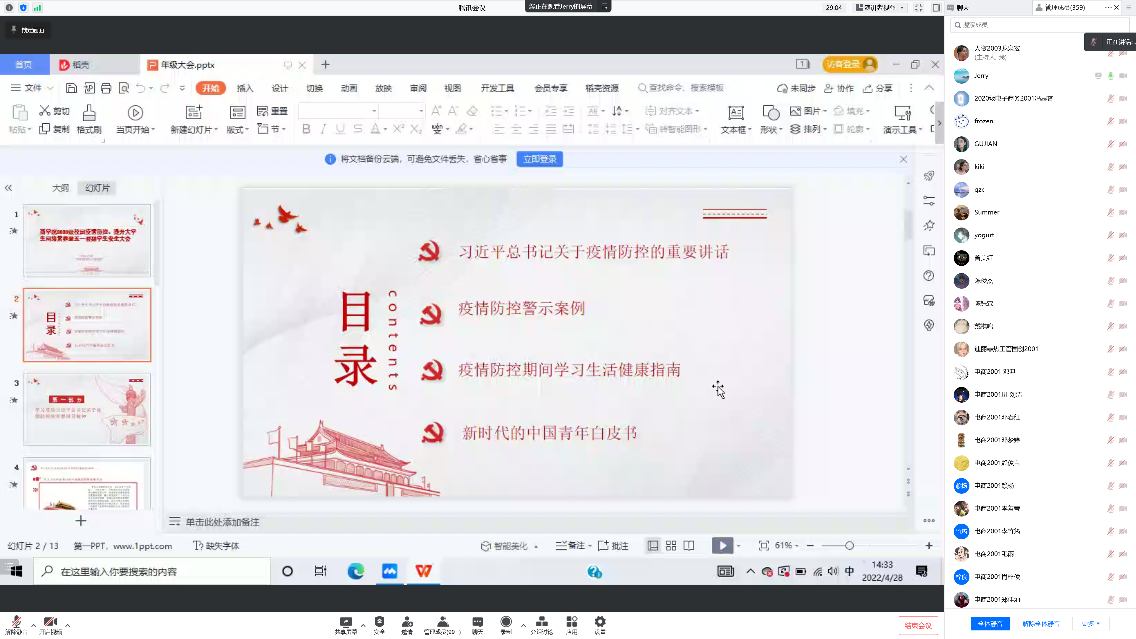 各年级辅导员还带领学生学习习近平总书记关于疫情防控工作的重要讲话精神,引导同学们深刻认识防疫工作的重要性,以及疫情防控中彰显出的中国共产党领导和中国特色社会主义制度的显著优势。同时,通过高校疫情防控警示案例讲解宣传学校的疫情防控要求,学习疫情防控期间学习生活健康指南,引导同学们严格遵守属地和学校的防疫要求,积极调适心态,主动适应疫情背景下的学习节奏和生活方式。